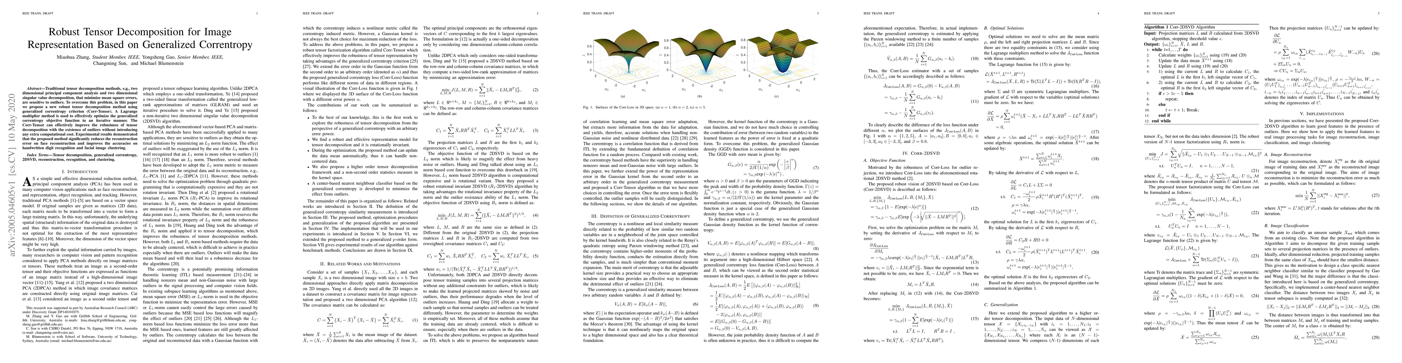 This paper proposes a robust tensor decomposition method, Corr-Tensor, based on generalized correntropy to minimize the impact of outliers. The method uses a Lagrange multiplier to optimize the objective function iteratively, achieving improved robustness without extra computational costs. Experimental results show significant reductions in reconstruction error and enhanced accuracy in tasks like face reconstruction, handwritten digit recognition, and facial image clustering.