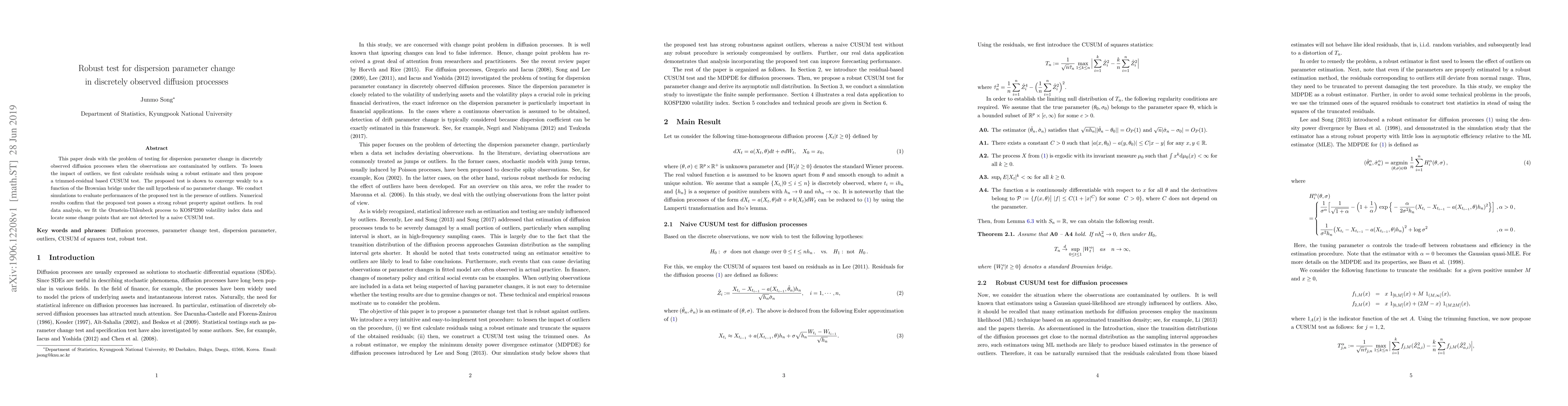 This paper proposes a robust CUSUM test for detecting changes in the dispersion parameter of discretely observed diffusion processes, using trimmed residuals to mitigate outlier effects. Simulation results show the test's strong robustness against outliers, and it successfully identifies change points in KOSPI200 volatility index data not detected by traditional methods.