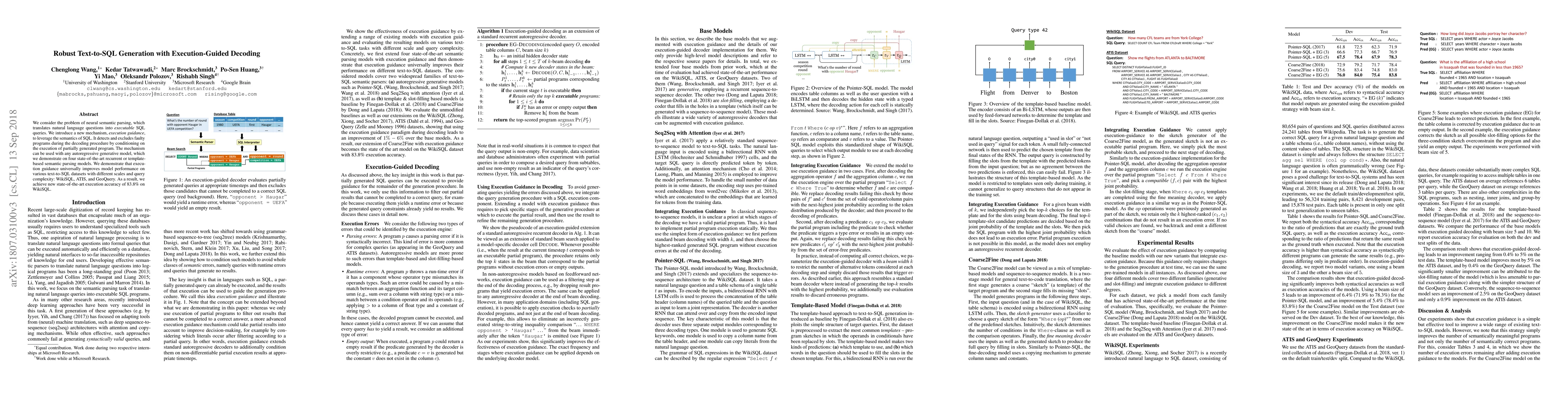 This paper introduces a novel execution-guided decoding mechanism to enhance neural semantic parsing for text-to-SQL generation, achieving improved accuracy by conditioning on the execution of partially generated SQL queries. The method demonstrates state-of-the-art performance across multiple datasets, including WikiSQL, ATIS, and GeoQuery.