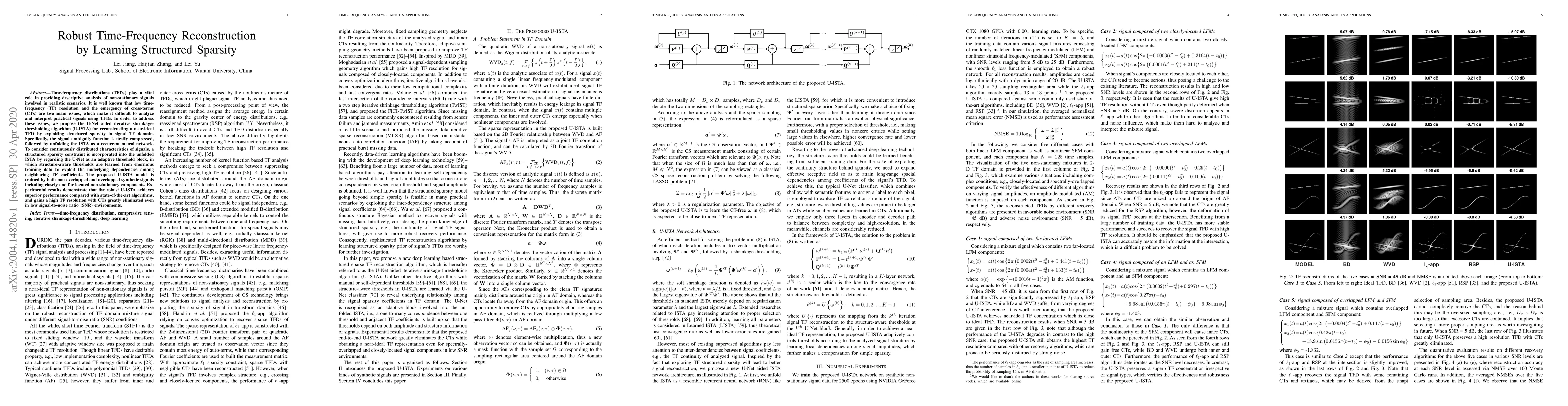 Time-frequency distributions (TFDs) play a vital role in providing descriptive analysis of non-stationary signals involved in realistic scenarios. It is well known that low time-frequency (TF) resolution and the emergency of cross-terms (CTs) are two main issues, which make it difficult to analyze and interpret practical signals using TFDs. In order to address these issues, we propose the U-Net aided iterative shrinkage-thresholding algorithm (U-ISTA) for reconstructing a near-ideal TFD by exploiting structured sparsity in signal TF domain. Specifically, the signal ambiguity function is firstly compressed, followed by unfolding the ISTA as a recurrent neural network. To consider continuously distributed characteristics of signals, a structured sparsity constraint is incorporated into the unfolded ISTA by regarding the U-Net as an adaptive threshold block, in which structure-aware thresholds are learned from enormous training data to exploit the underlying dependencies among neighboring TF coefficients. The proposed U-ISTA model is trained by both non-overlapped and overlapped synthetic signals including closely and far located non-stationary components. Experimental results demonstrate that the robust U-ISTA achieves superior performance compared with state-of-the-art algorithms, and gains a high TF resolution with CTs greatly eliminated even in low signal-to-noise ratio (SNR) environments.