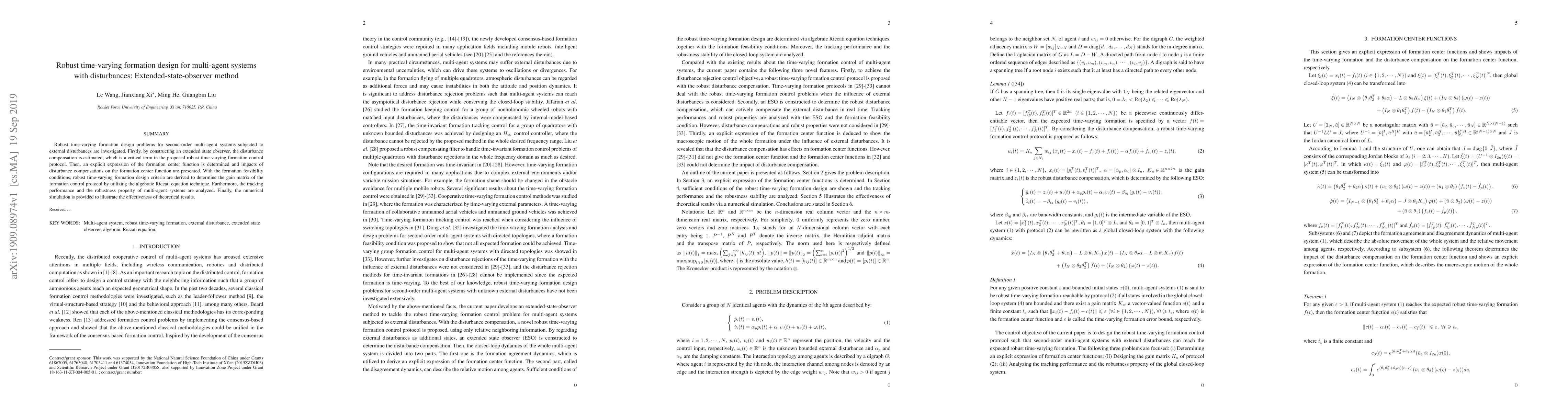 This paper proposes a robust time-varying formation design method for second-order multi-agent systems using an extended-state-observer to estimate and compensate for external disturbances. The method determines the formation center function and derives robust control criteria using the algebraic Riccati equation, ensuring tracking performance and robustness, validated by numerical simulations.