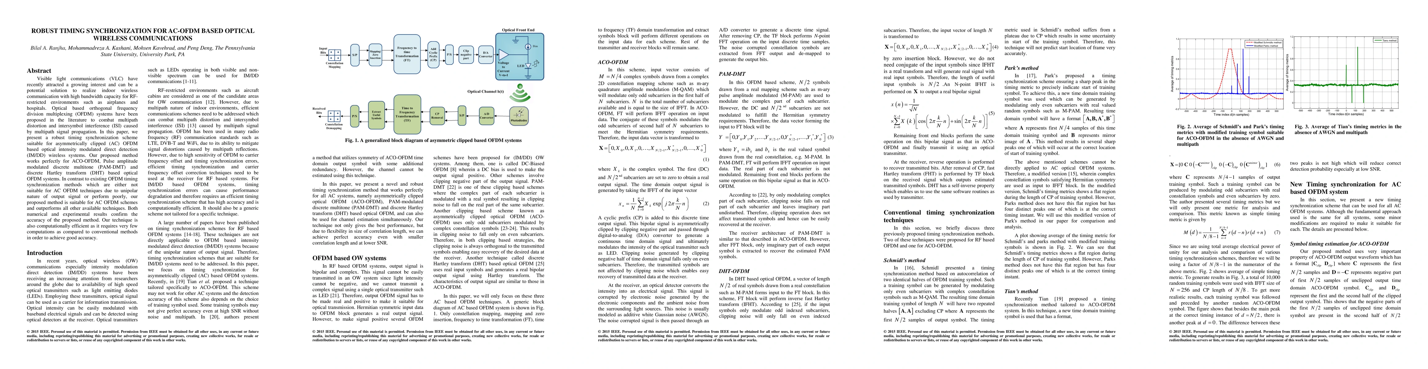 This paper proposes a robust timing synchronization scheme for AC-OFDM based optical wireless communications, specifically for IM/DD systems. The method is shown to outperform existing techniques, offering high accuracy and computational efficiency.