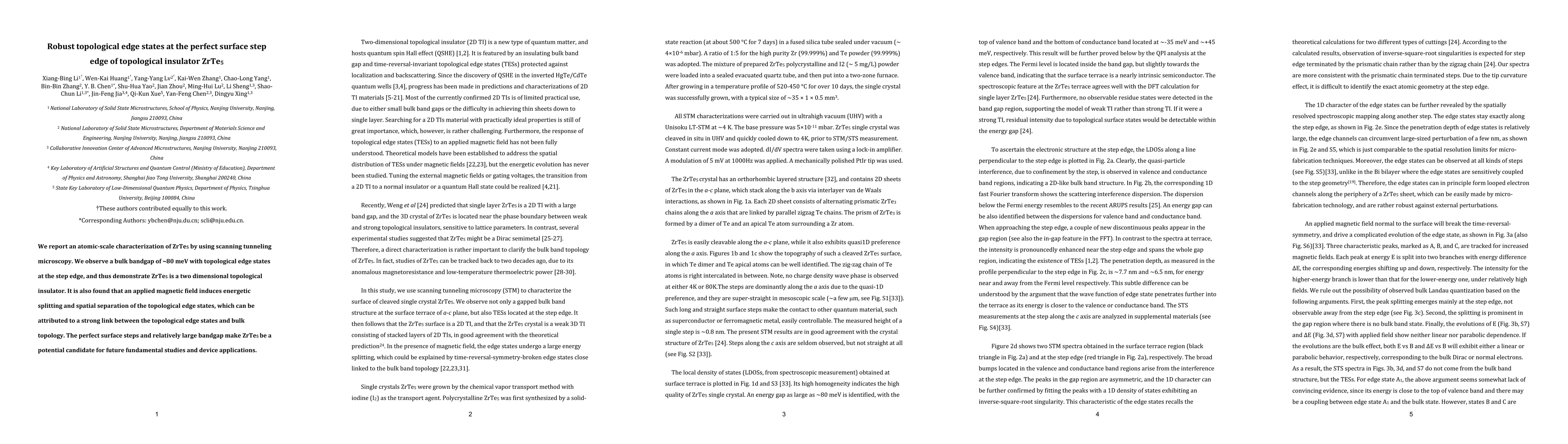 This paper reports the atomic-scale characterization of ZrTe$_5$ using scanning tunneling microscopy, revealing topological edge states at surface step edges and a bulk bandgap of ~80 meV, confirming ZrTe$_5$ as a two-dimensional topological insulator. An applied magnetic field induces splitting and separation of these edge states, highlighting a strong connection between edge states and bulk topology.