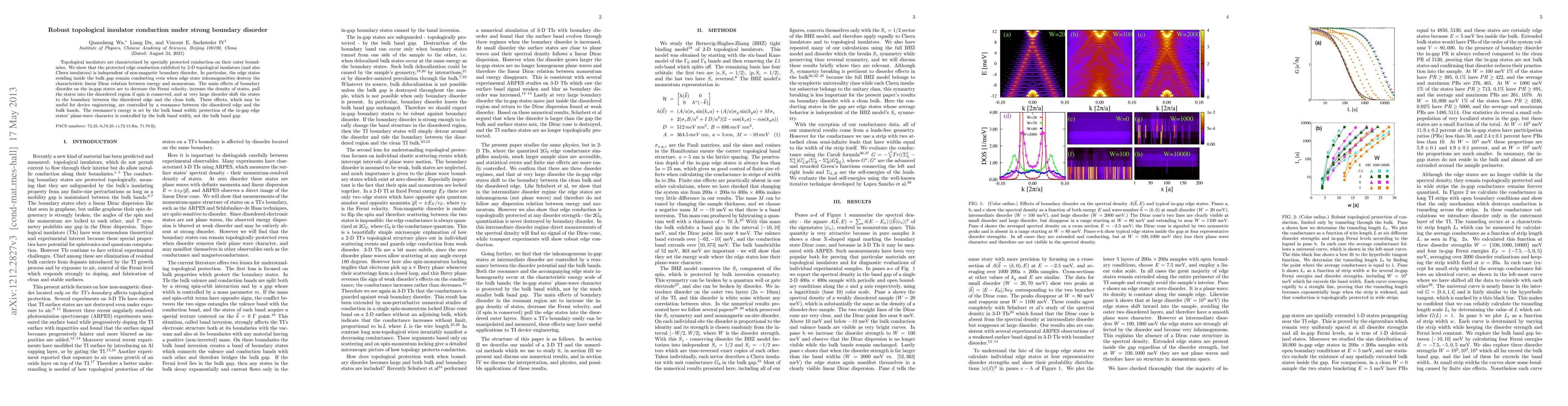 This paper demonstrates that the protected edge conduction in 2-D topological insulators remains robust against strong non-magnetic boundary disorder, maintaining the conducting edge states within the bulk gap despite disruptions. The primary effects of disorder include reduced Fermi velocity, increased density of states, and state shifts, all controlled by a resonance between the disordered edge and bulk bands.