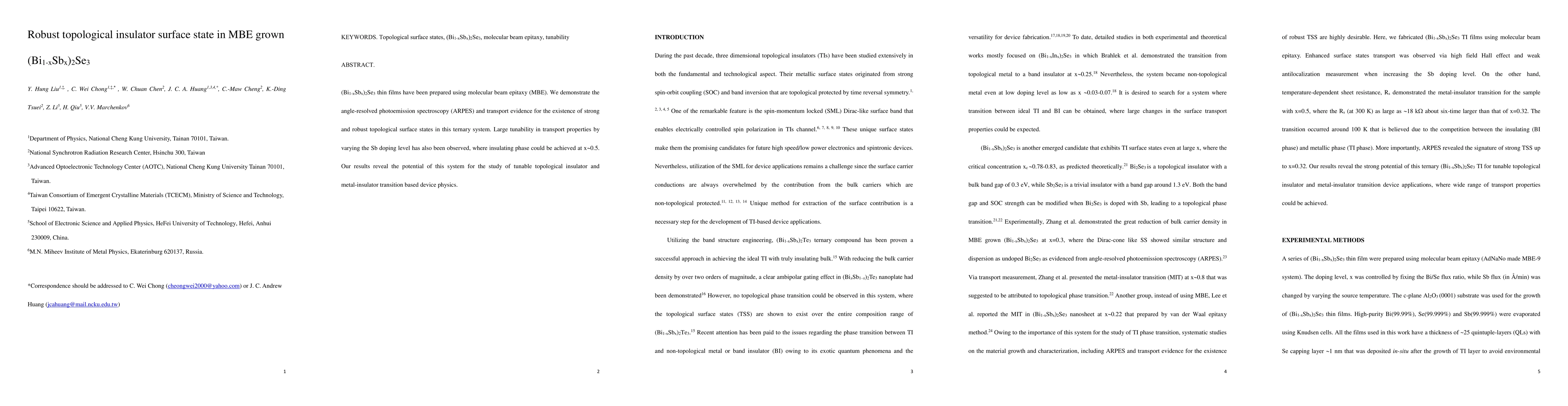 This paper reports the successful growth of (Bi1-xSbx)2Se3 thin films using molecular beam epitaxy, demonstrating robust topological surface states via ARPES and transport measurements. The study highlights significant tunability in transport properties with Sb doping, achieving an insulating phase at x=0.5, indicating potential for tunable topological insulator devices.
