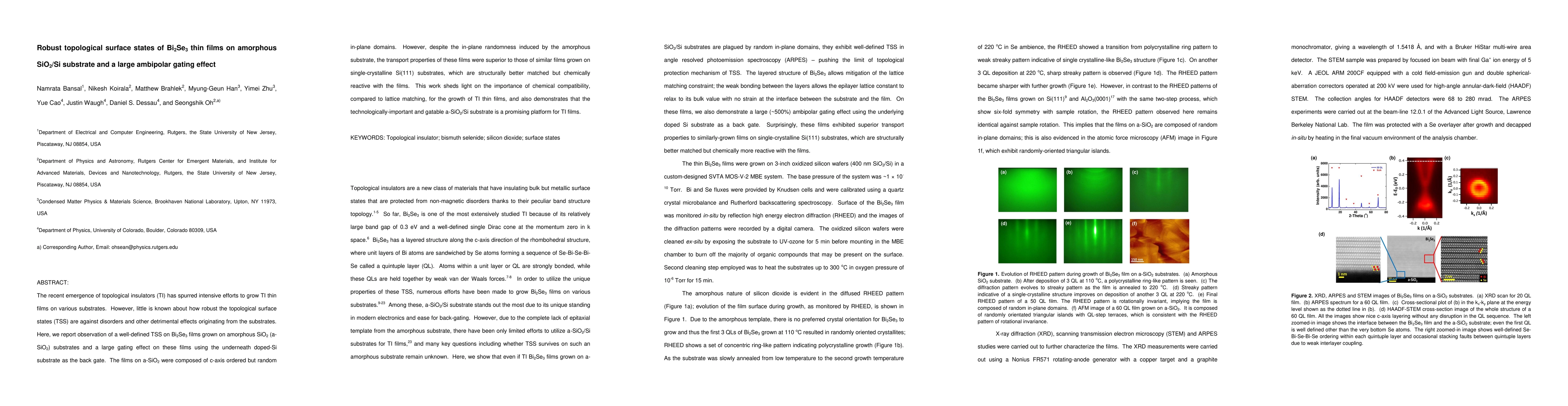 This paper reports the successful growth of Bi2Se3 topological insulator thin films on amorphous SiO2/Si substrates, demonstrating robust topological surface states despite in-plane disorder and a significant ambipolar gating effect, highlighting chemical compatibility over lattice matching for TI film growth.