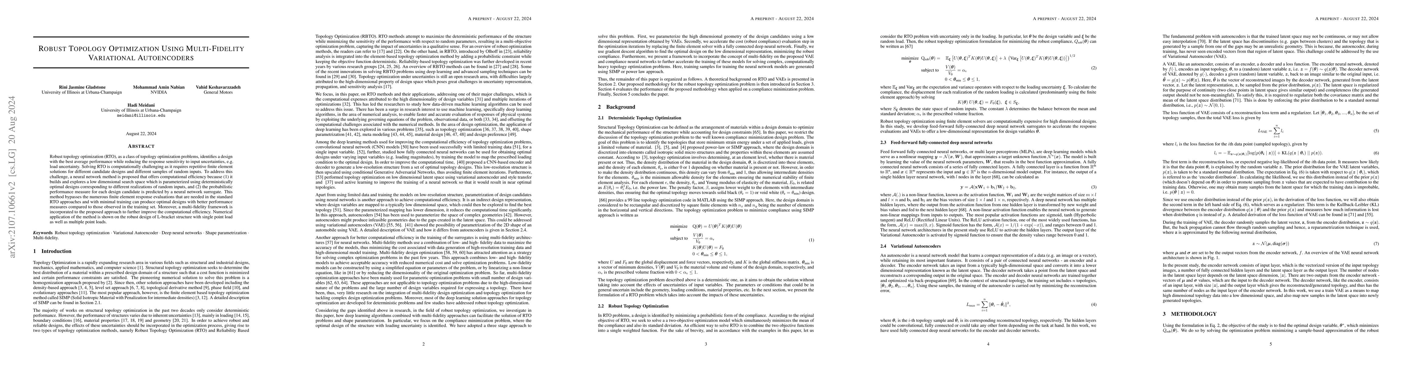This paper proposes a robust topology optimization method using Variational Autoencoders (VAE) to transform high-dimensional design spaces into lower dimensions, enabling faster computation via neural network surrogates. The VAE and neural network approximations facilitate gradient-based optimization, resulting in optimal designs with lower robust compliances.