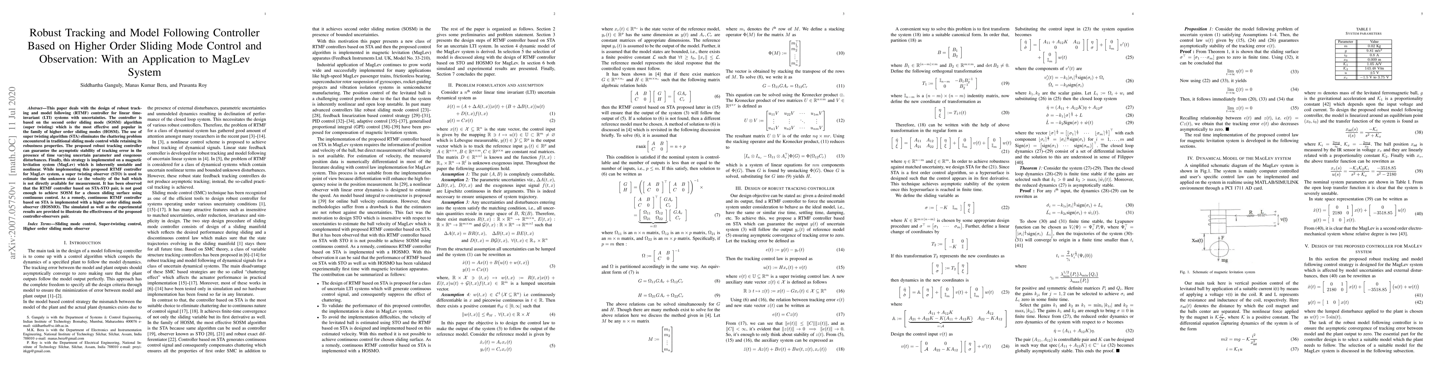 This paper designs a robust tracking and model following controller based on the super twisting algorithm for linear time-invariant systems, addressing uncertainties and eliminating chattering. The proposed controller is implemented on a magnetic levitation system using a super twisting observer, later enhanced with a higher order sliding mode observer for better performance.
