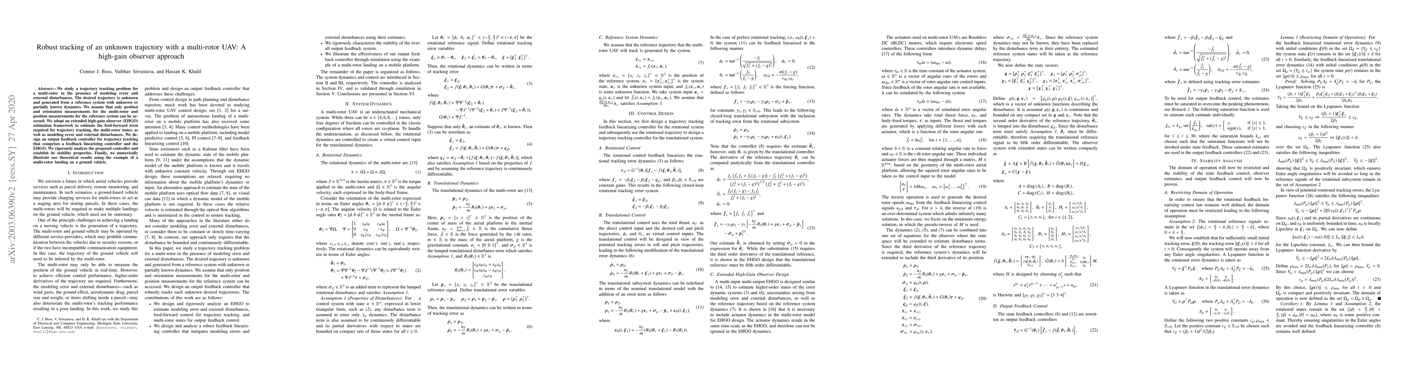 This paper proposes an extended high-gain observer (EHGO) framework for robust trajectory tracking of a multi-rotor UAV with unknown dynamics and disturbances. The EHGO estimates necessary feed-forward terms and system uncertainties, enabling an output feedback controller to achieve stable tracking despite limited measurements.