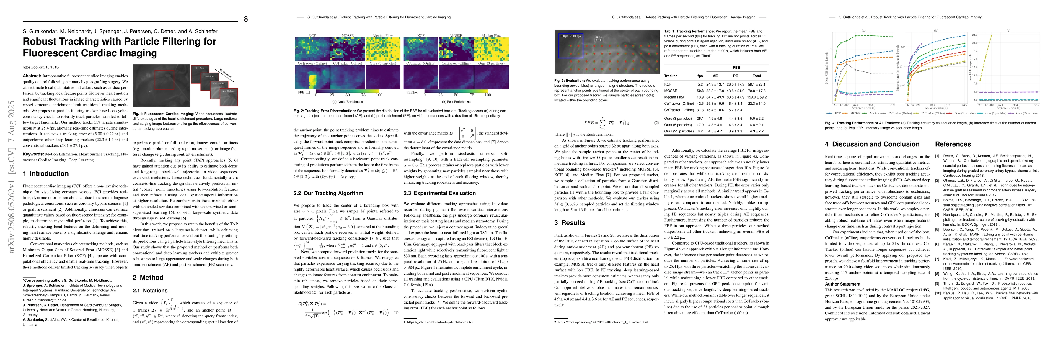 Intraoperative fluorescent cardiac imaging enables quality control following coronary bypass grafting surgery. We can estimate local quantitative indicators, such as cardiac perfusion, by tracking local feature points. However, heart motion and significant fluctuations in image characteristics caused by vessel structural enrichment limit traditional tracking methods. We propose a particle filtering tracker based on cyclicconsistency checks to robustly track particles sampled to follow target landmarks. Our method tracks 117 targets simultaneously at 25.4 fps, allowing real-time estimates during interventions. It achieves a tracking error of (5.00 +/- 0.22 px) and outperforms other deep learning trackers (22.3 +/- 1.1 px) and conventional trackers (58.1 +/- 27.1 px).