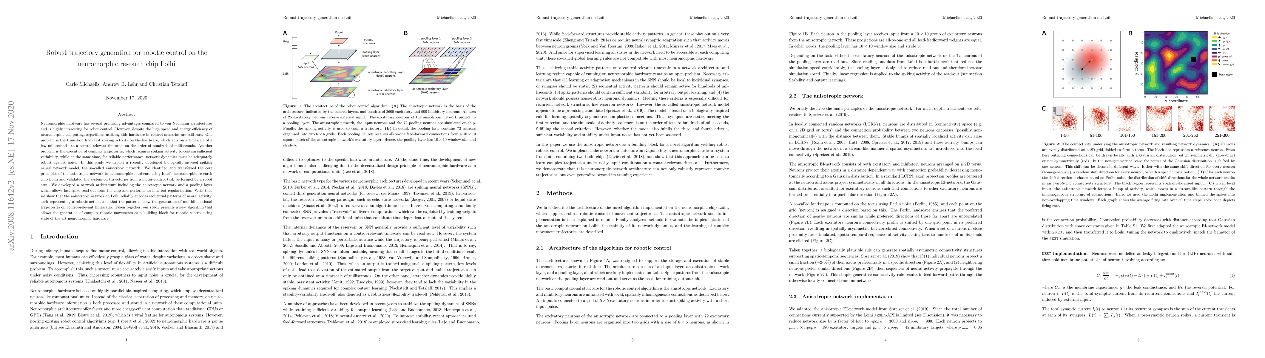 This paper presents a novel algorithm for generating robust robotic trajectories using neuromorphic hardware, specifically Intel's Loihi chip. The study adapts a biologically-inspired anisotropic network model to Loihi, demonstrating the generation of multidimensional control signals on relevant timescales, enabling complex robotic movements.