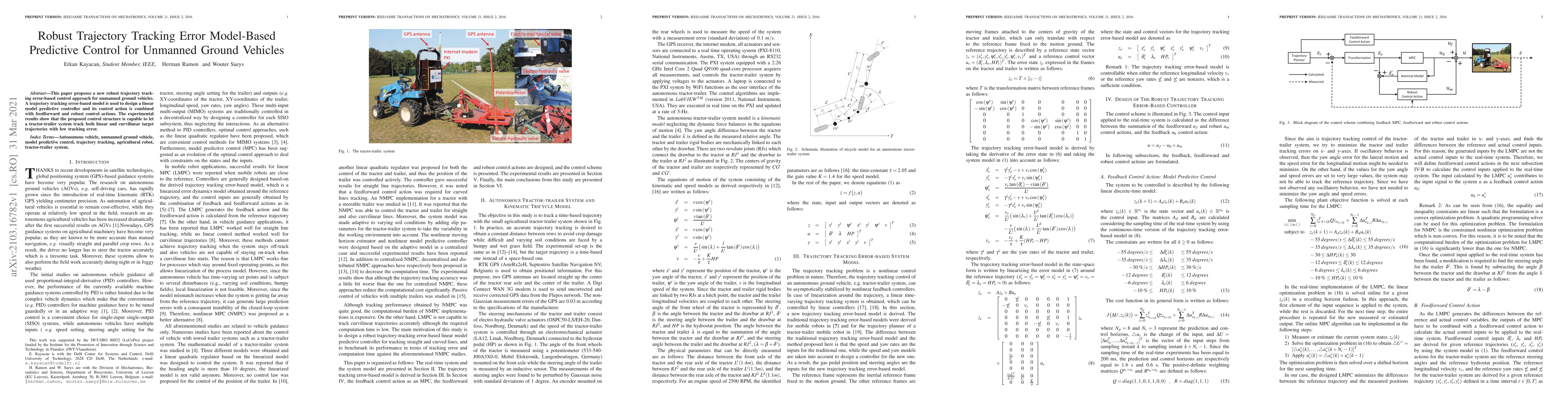 This paper proposes a new robust trajectory tracking error-based control approach for unmanned ground vehicles. A trajectory tracking error-based model is used to design a linear model predictive controller and its control action is combined with feedforward and robust control actions. The experimental results show that the proposed control structure is capable to let a tractor-trailer system track both linear and curvilinear target trajectories with low tracking error.