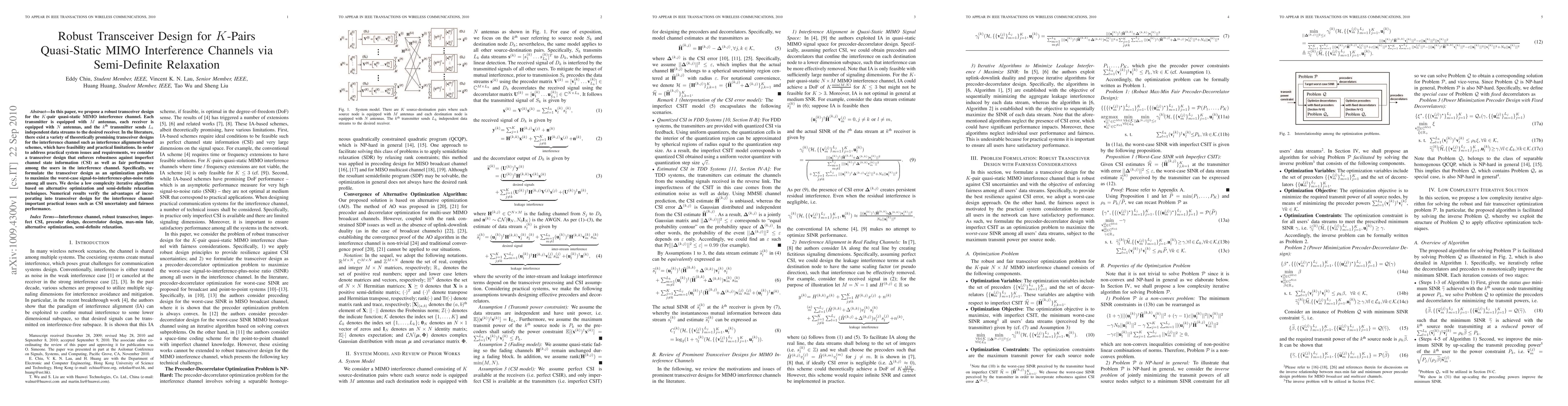 This paper proposes a robust transceiver design for K-pair quasi-static MIMO interference channels, addressing practical issues like imperfect channel state information and user fairness through optimization and semi-definite relaxation. The approach uses an iterative algorithm to maximize the worst-case signal-to-interference-plus-noise ratio.