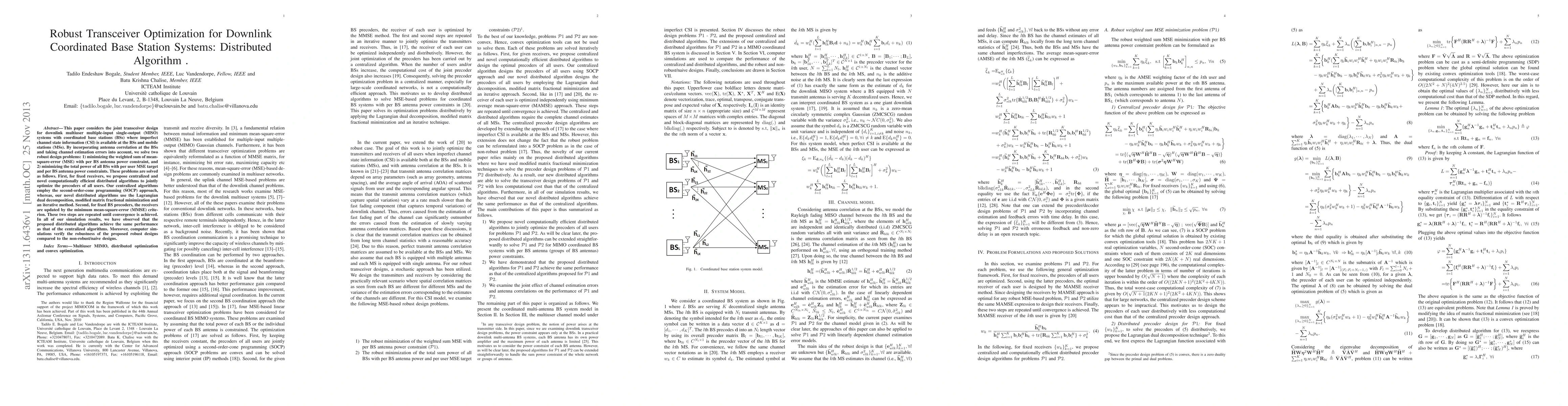This paper proposes distributed algorithms for optimizing transceivers in coordinated multiuser MISO systems, addressing imperfect channel state information and antenna correlation. It achieves robust performance by minimizing MSE and total power while maintaining convergence, with distributed algorithms matching centralized approaches in simulations.