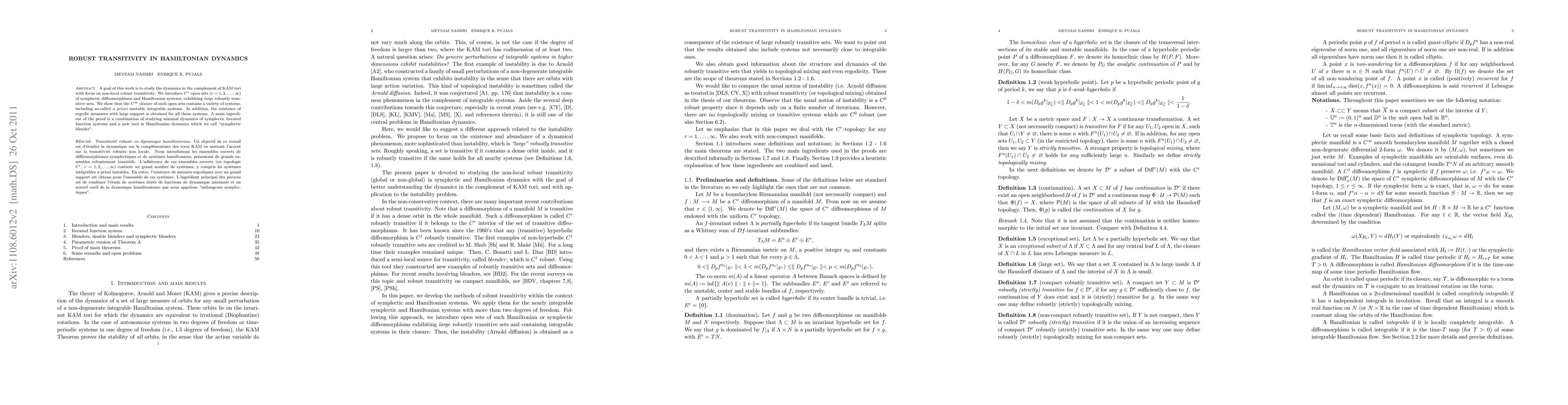 This paper investigates Hamiltonian dynamics outside KAM tori, focusing on non-local robust transitivity. It introduces $C^r$ open sets of symplectic diffeomorphisms with "large" robustly transitive sets, including a priori unstable integrable systems, and proves the existence of ergodic measures with large support, utilizing minimal dynamics and a novel symplectic blender tool.