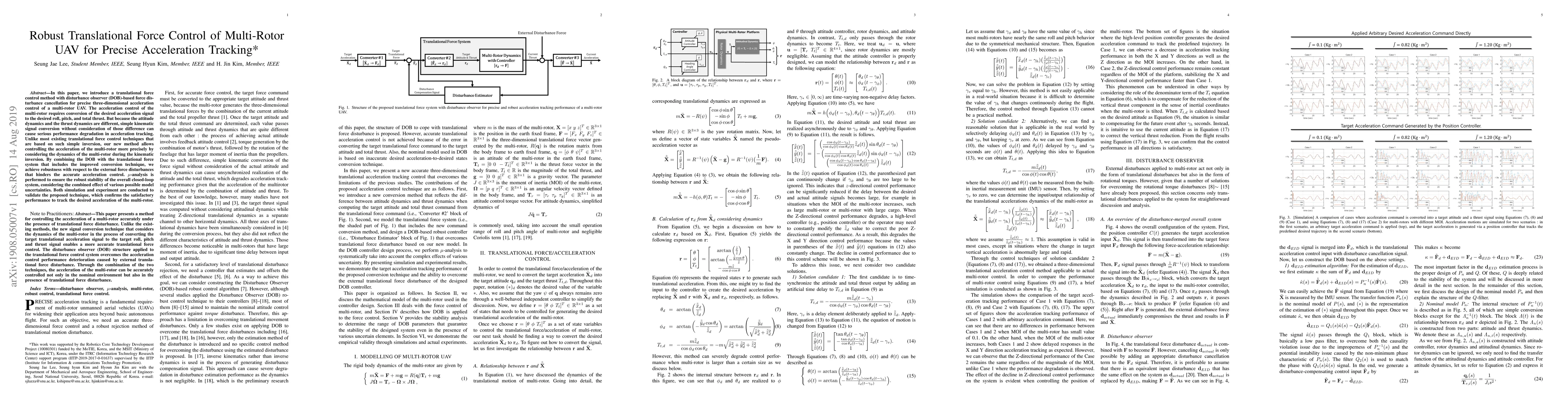 This paper proposes a translational force control method with a disturbance observer for precise three-dimensional acceleration control of a multi-rotor UAV, incorporating improved dynamics-aware kinematic inversion and robust stability analysis to achieve accurate acceleration tracking despite external disturbances. Simulation and experimental results validate the effectiveness of the proposed technique.