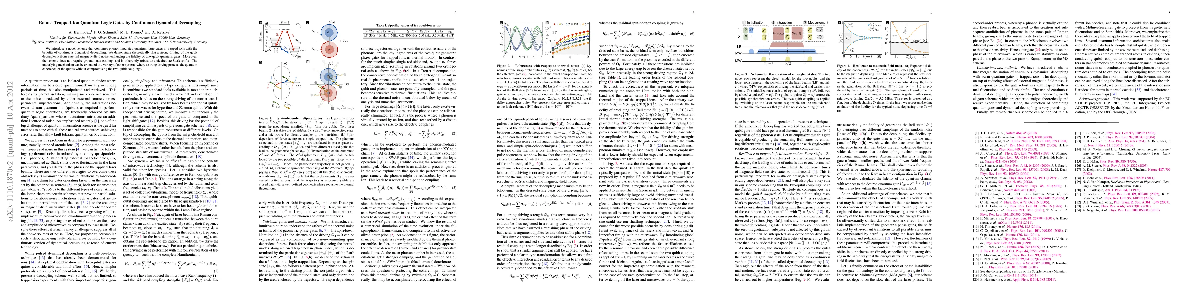This paper proposes a method combining phonon-mediated quantum logic gates in trapped ions with continuous dynamical decoupling to enhance gate fidelity by decoupling qubits from magnetic-field noise. The approach is robust, does not require ground-state cooling, and can be applied to various systems to protect qubit coherence.
