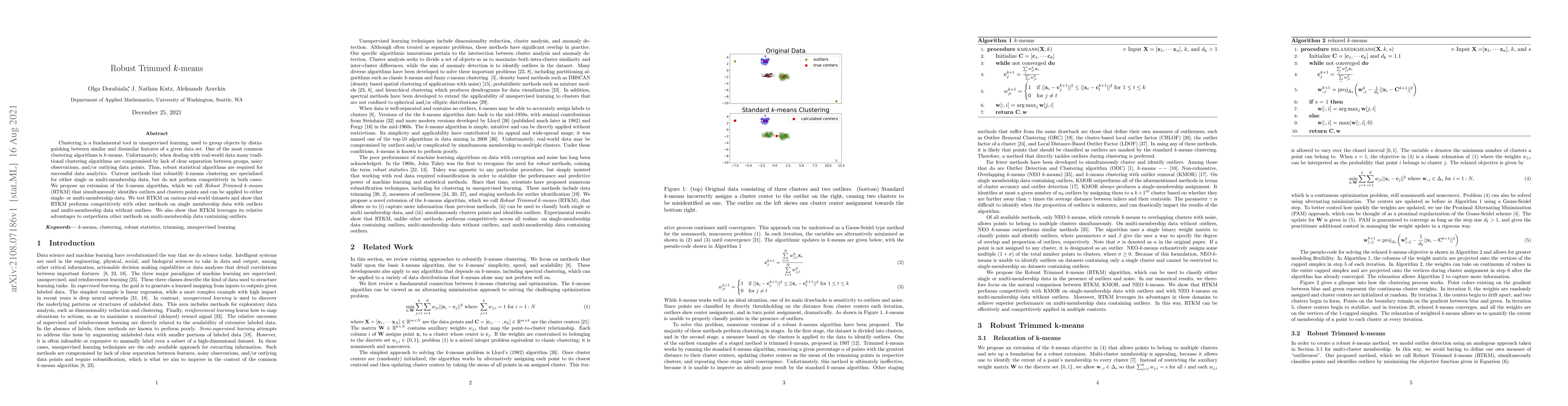 The paper proposes Robust Trimmed k-means (RTKM), an extension of the k-means algorithm designed to robustly cluster data by identifying outliers, performing competitively on both single-membership and multi-membership datasets. RTKM outperforms other methods especially on multi-membership data with outliers.