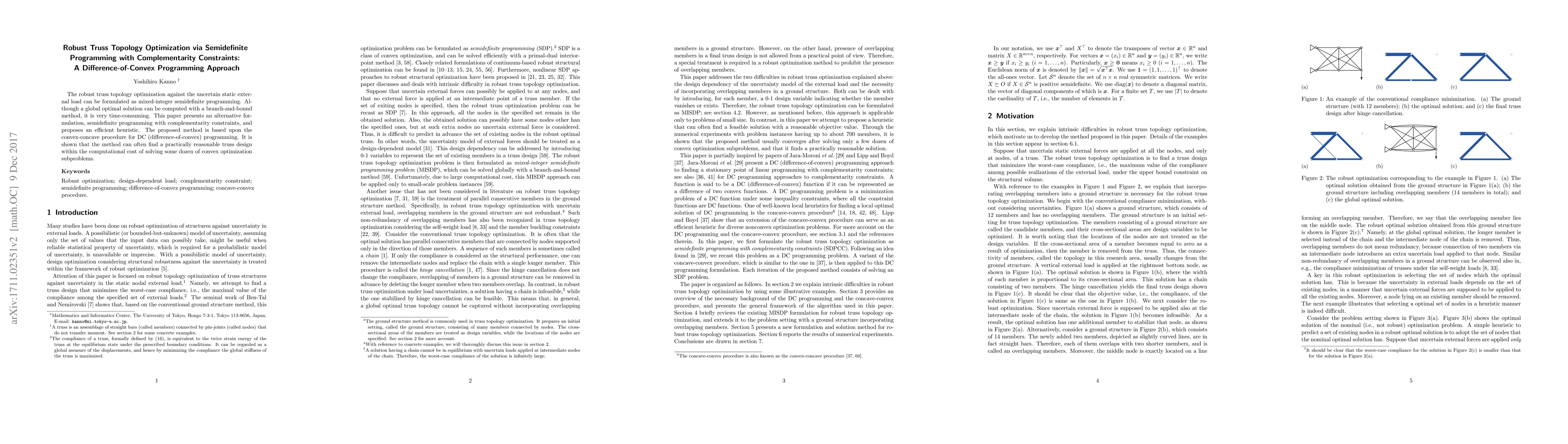The robust truss topology optimization against the uncertain static external load can be formulated as mixed-integer semidefinite programming. Although a global optimal solution can be computed with a branch-and-bound method, it is very time-consuming. This paper presents an alternative formulation, semidefinite programming with complementarity constraints, and proposes an efficient heuristic. The proposed method is based upon the convex-concave procedure for DC (difference-of-convex) programming. It is shown that the method can often find a practically reasonable truss design within the computational cost of solving some dozen of convex optimization subproblems.