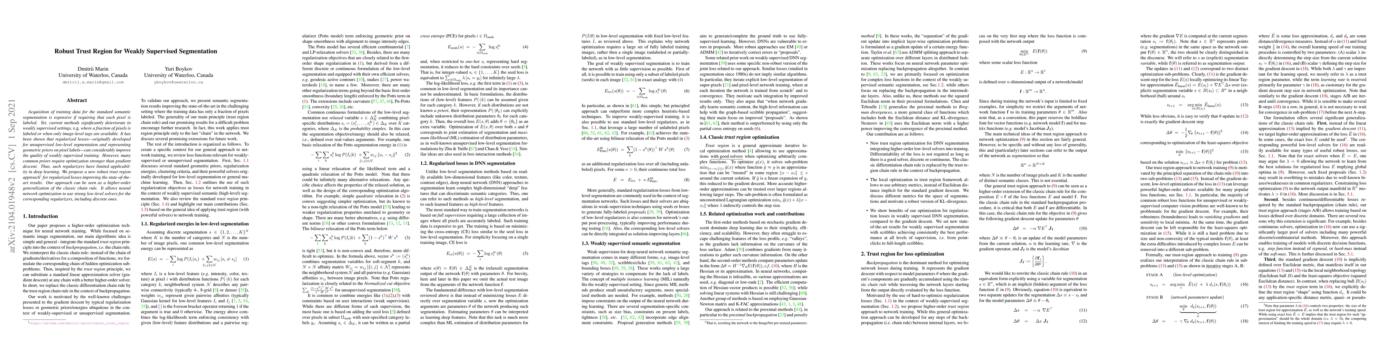 This paper proposes a robust trust region method for optimizing regularized losses in weakly supervised semantic segmentation, improving state-of-the-art results. The approach generalizes the classic chain rule, enabling the use of strong solvers for regularizers, thus overcoming limitations in deep learning optimization.