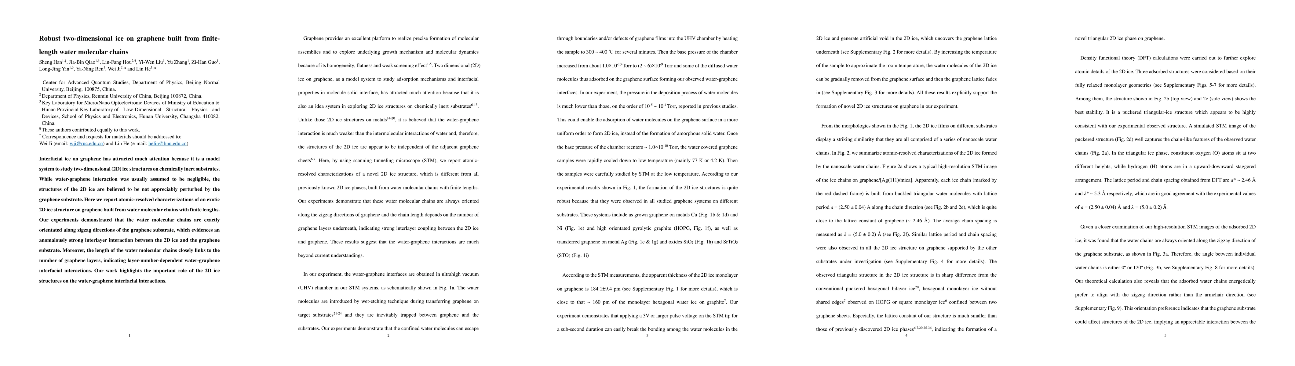 This study reveals atomic-resolved 2D ice structures on graphene, composed of finite-length water molecular chains oriented along graphene's zigzag directions. The findings indicate an unusually strong interaction between the 2D ice and graphene, dependent on graphene's layer number.