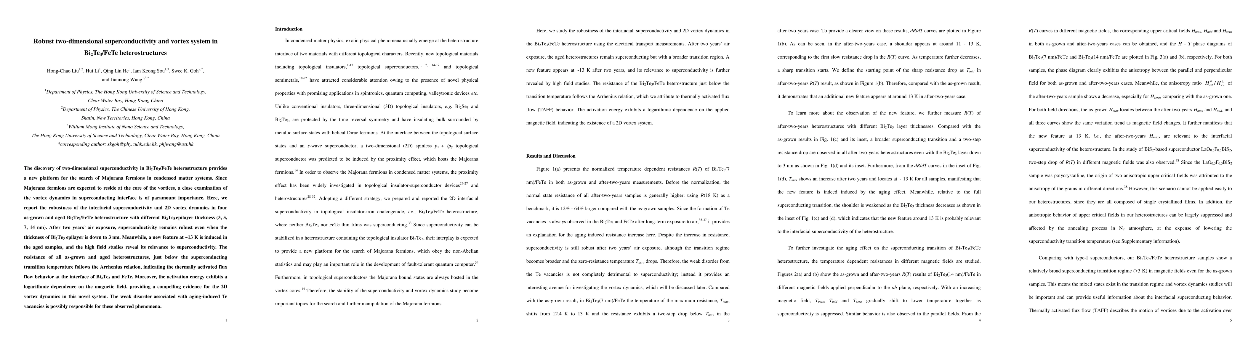 This paper investigates the robustness of two-dimensional superconductivity and vortex dynamics in Bi2Te3/FeTe heterostructures, revealing that superconductivity remains stable even after two years of air exposure and varying Bi2Te3 epilayer thicknesses. The study highlights a new feature at ~13 K in aged samples and provides evidence for 2D vortex dynamics through the logarithmic dependence of activation energy on magnetic field.