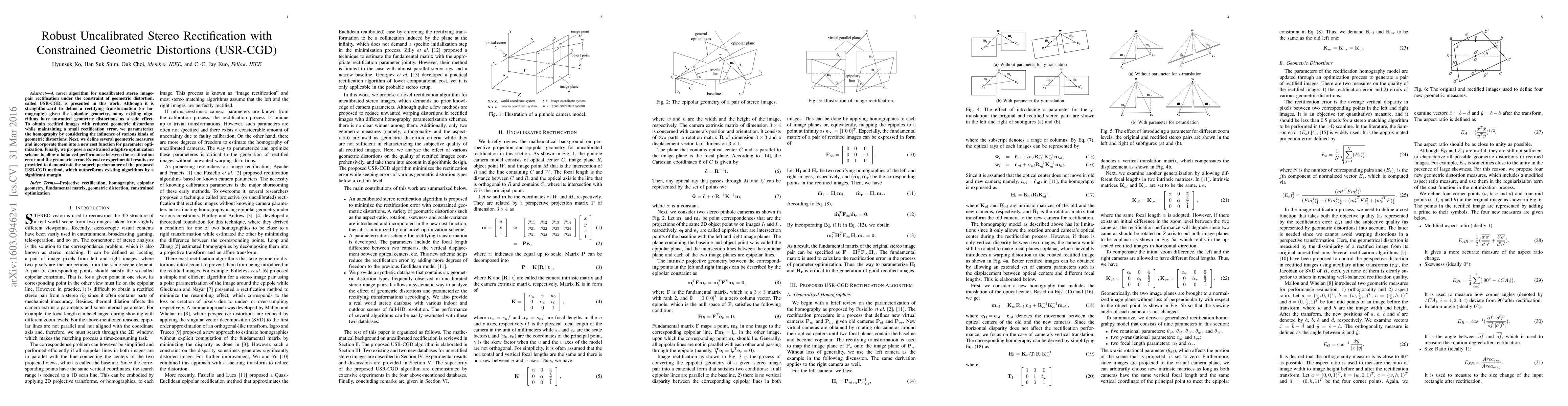 A new algorithm, USR-CGD, rectifies uncalibrated stereo images with reduced geometric distortions while maintaining small rectification errors. It outperforms existing algorithms by a significant margin.