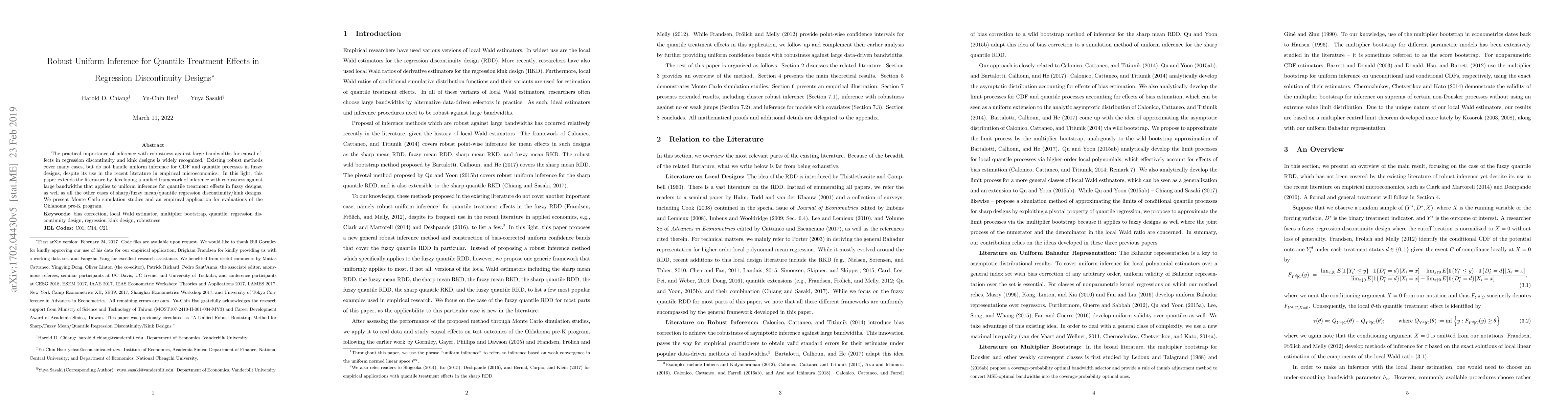 The practical importance of inference with robustness against large bandwidths for causal effects in regression discontinuity and kink designs is widely recognized. Existing robust methods cover many cases, but do not handle uniform inference for CDF and quantile processes in fuzzy designs, despite its use in the recent literature in empirical microeconomics. In this light, this paper extends the literature by developing a unified framework of inference with robustness against large bandwidths that applies to uniform inference for quantile treatment effects in fuzzy designs, as well as all the other cases of sharp/fuzzy mean/quantile regression discontinuity/kink designs. We present Monte Carlo simulation studies and an empirical application for evaluations of the Oklahoma pre-K program.