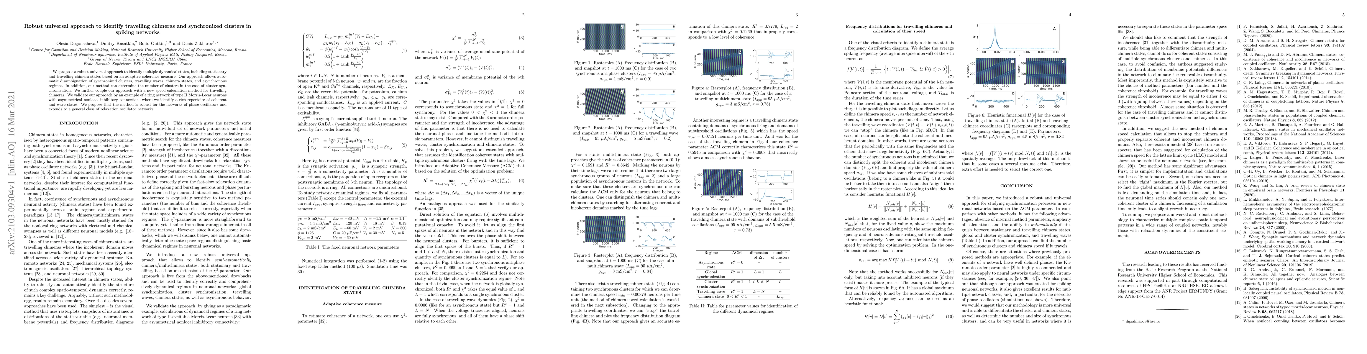 This paper introduces a robust universal method to identify various dynamical states, including travelling chimeras and synchronized clusters, in spiking networks using an adaptive coherence measure. The method can automatically distinguish between different states and determine the number of synchronized clusters, validated through a ring network of Morris-Lecar neurons.