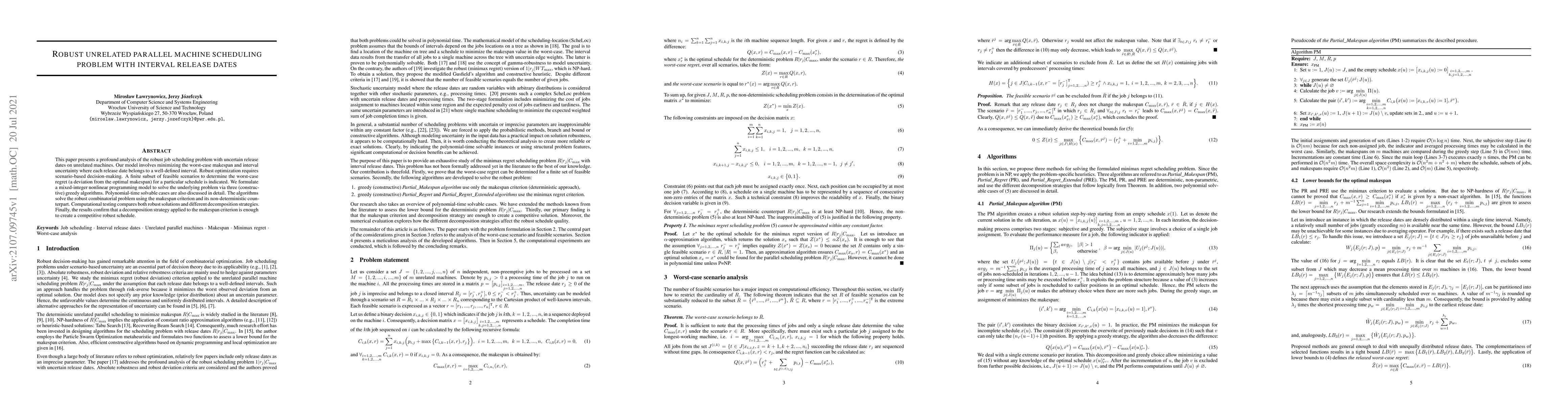 This paper presents a profound analysis of the robust job scheduling problem with uncertain release dates on unrelated machines. Our model involves minimizing the worst-case makespan and interval uncertainty where each release date belongs to a well-defined interval. Robust optimization requires scenario-based decision-making. A finite subset of feasible scenarios to determine the worst-case regret (a deviation from the optimal makespan) for a particular schedule is indicated. We formulate a mixed-integer nonlinear programming model to solve the underlying problem via three (constructive) greedy algorithms. Polynomial-time solvable cases are also discussed in detail. The algorithms solve the robust combinatorial problem using the makespan criterion and its non-deterministic counterpart. Computational testing compares both robust solutions and different decomposition strategies. Finally, the results confirm that a decomposition strategy applied to the makespan criterion is enough to create a competitive robust schedule.