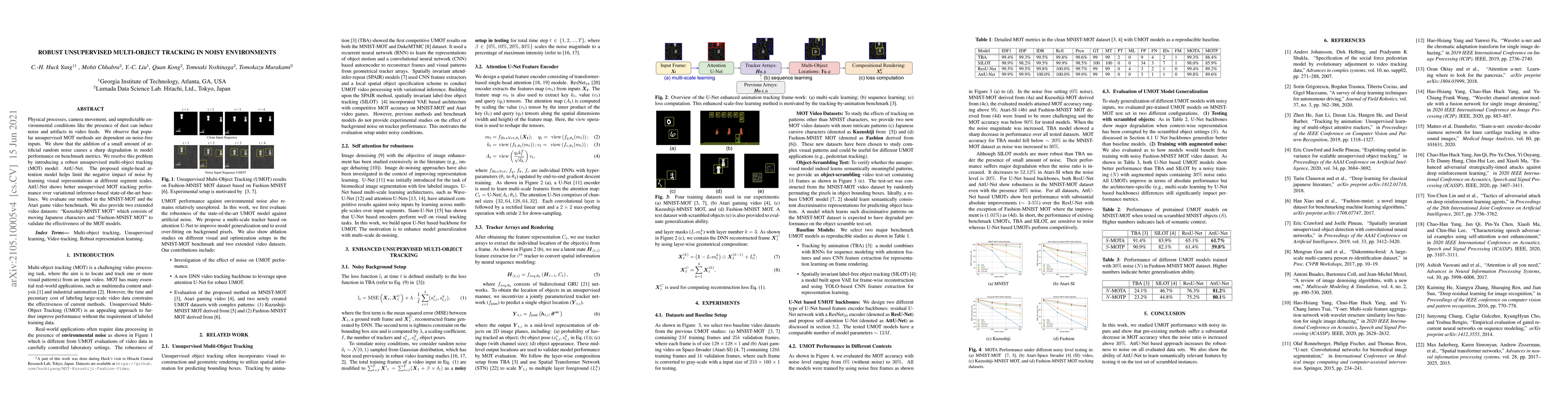 This paper introduces AttU-Net, a robust unsupervised multi-object tracking model that mitigates the negative impact of noise in video feeds, outperforming state-of-the-art baselines on benchmark metrics. The model employs a single-head attention mechanism to learn visual representations at different scales, validated on extended video datasets including MNIST-MOT and Atari game videos.