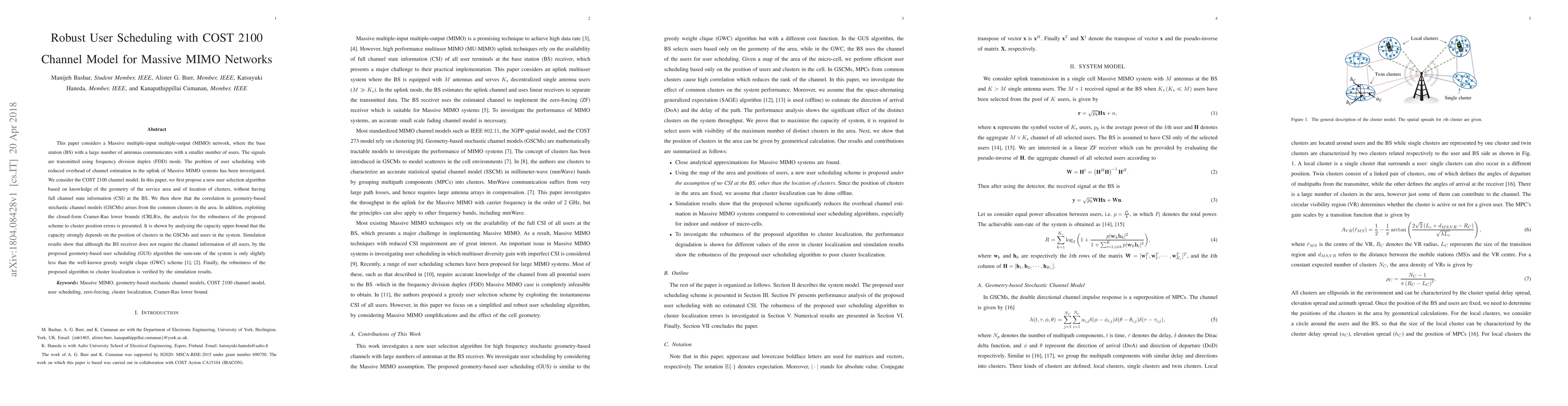 This paper proposes a new geometry-based user scheduling algorithm for Massive MIMO networks using the COST 2100 channel model, which minimizes channel estimation overhead. The algorithm leverages cluster geometry knowledge without requiring full channel state information, demonstrating robustness to cluster position errors and achieving near-optimal sum-rate performance compared to the greedy weight clique scheme.