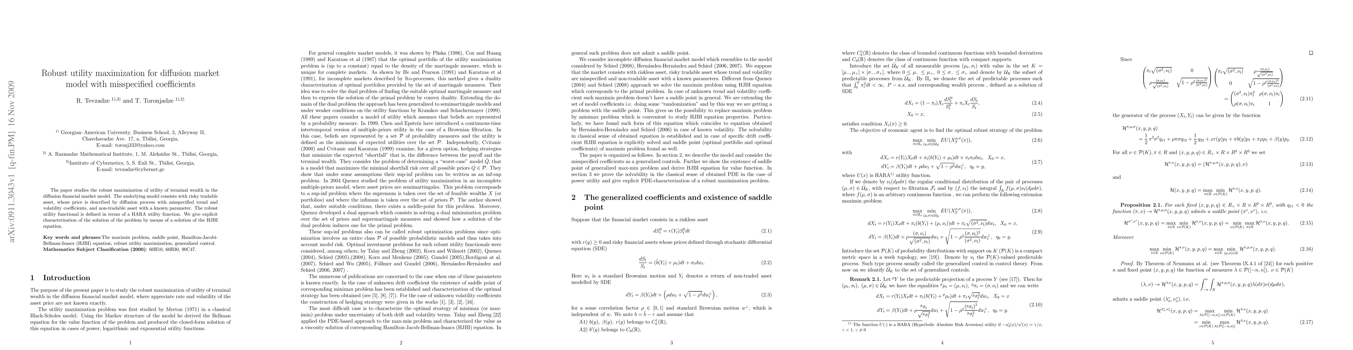 The paper investigates the robust utility maximization for terminal wealth in a diffusion market model with misspecified coefficients, deriving an explicit solution through the HJBI equation and using a HARA utility function.