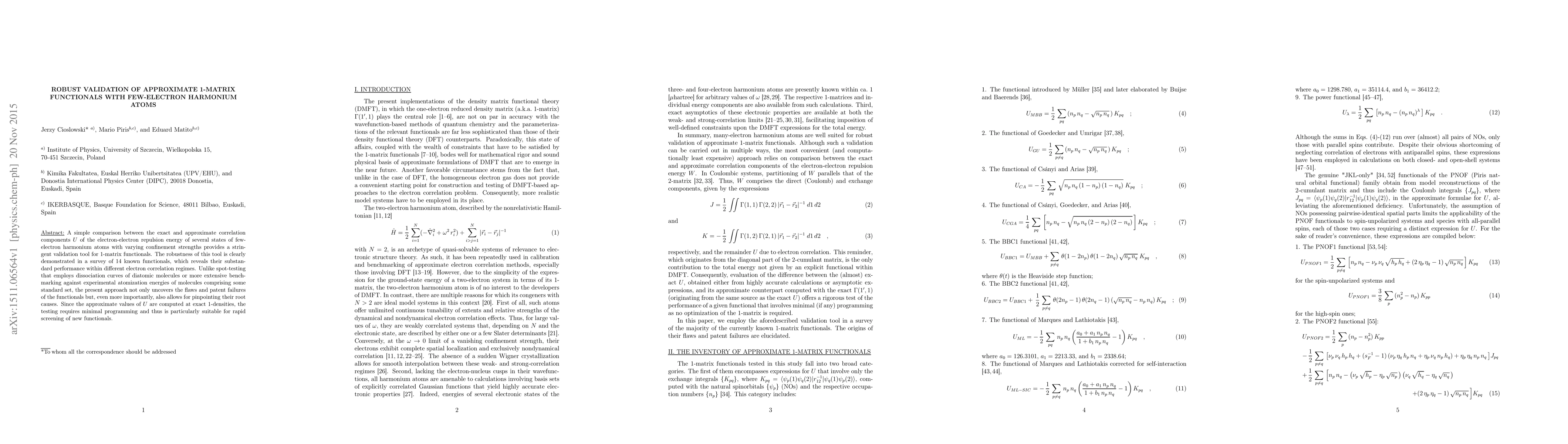This paper validates 1-matrix functionals using a comparison of exact and approximate electron-electron repulsion energies in few-electron harmonium atoms, revealing significant flaws in 14 surveyed functionals. The method offers a simple, effective, and minimal-programming tool for quickly screening new functionals.
