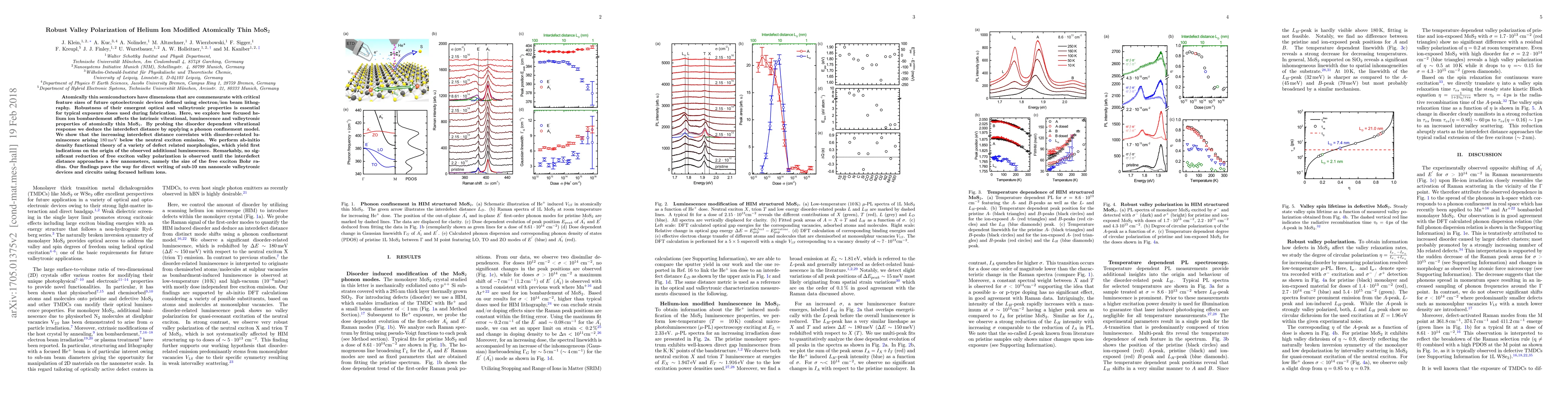 Atomically thin semiconductors have dimensions that are commensurate with critical feature sizes of future optoelectronic devices defined using electron/ion beam lithography. Robustness of their emergent optical and valleytronic properties is essential for typical exposure doses used during fabrication. Here, we explore how focused helium ion bombardment affects the intrinsic vibrational, luminescence and valleytronic properties of atomically thin MoS$_{2}$. By probing the disorder dependent vibrational response we deduce the interdefect distance by applying a phonon confinement model. We show that the increasing interdefect distance correlates with disorder-related luminescence arising 180 meV below the neutral exciton emission. We perform ab-initio density functional theory of a variety of defect related morphologies, which yield first indications on the origin of the observed additional luminescence. Remarkably, no significant reduction of free exciton valley polarization is observed until the interdefect distance approaches a few nanometers, namely the size of the free exciton Bohr radius. Our findings pave the way for direct writing of sub-10 nm nanoscale valleytronic devices and circuits using focused helium ions.