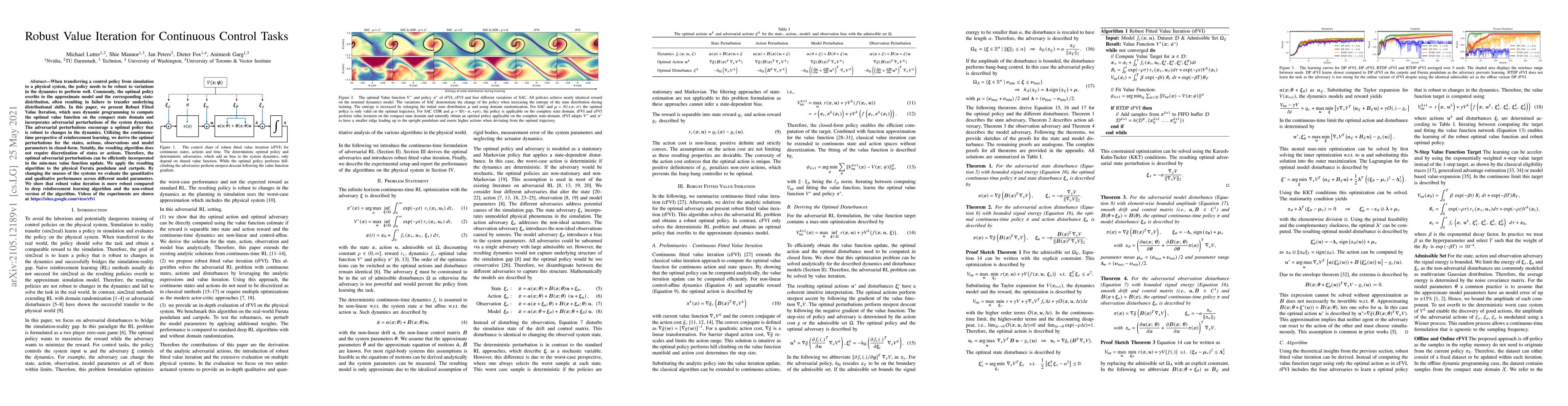 When transferring a control policy from simulation to a physical system, the policy needs to be robust to variations in the dynamics to perform well. Commonly, the optimal policy overfits to the approximate model and the corresponding state-distribution, often resulting in failure to trasnfer underlying distributional shifts. In this paper, we present Robust Fitted Value Iteration, which uses dynamic programming to compute the optimal value function on the compact state domain and incorporates adversarial perturbations of the system dynamics. The adversarial perturbations encourage a optimal policy that is robust to changes in the dynamics. Utilizing the continuous-time perspective of reinforcement learning, we derive the optimal perturbations for the states, actions, observations and model parameters in closed-form. Notably, the resulting algorithm does not require discretization of states or actions. Therefore, the optimal adversarial perturbations can be efficiently incorporated in the min-max value function update. We apply the resulting algorithm to the physical Furuta pendulum and cartpole. By changing the masses of the systems we evaluate the quantitative and qualitative performance across different model parameters. We show that robust value iteration is more robust compared to deep reinforcement learning algorithm and the non-robust version of the algorithm. Videos of the experiments are shown at https://sites.google.com/view/rfvi