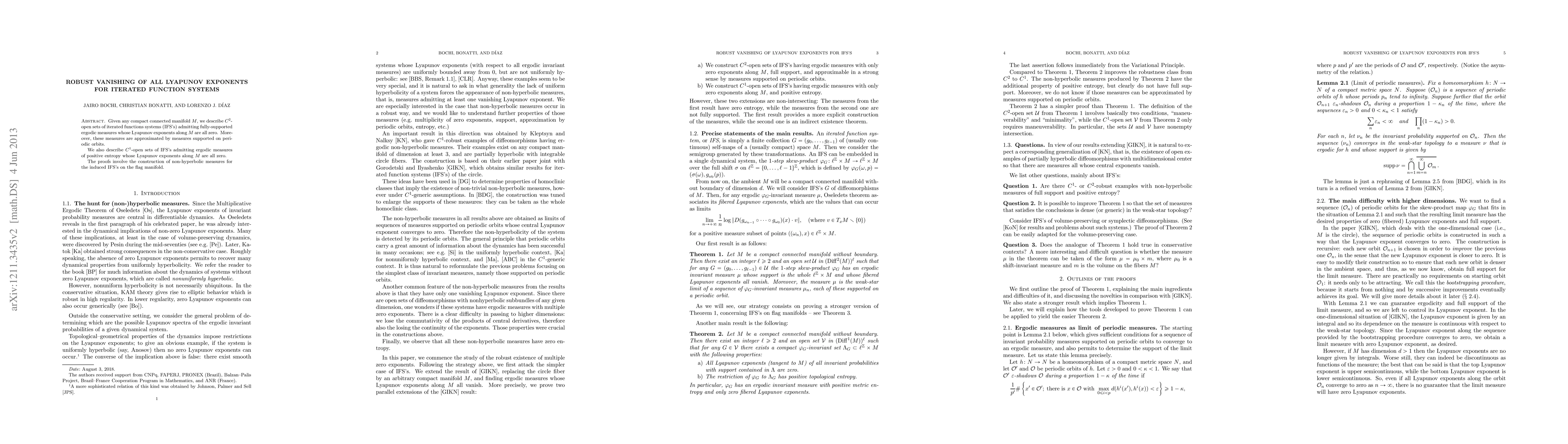 This paper explores the robust vanishing of all Lyapunov exponents for iterated function systems (IFS's) on compact connected manifolds, demonstrating $C^2$-open sets where ergodic measures exist with zero Lyapunov exponents, approximated by measures on periodic orbits. It also identifies $C^1$-open sets with ergodic measures of positive entropy and zero Lyapunov exponents, using non-hyperbolic measures on the flag manifold for proofs.