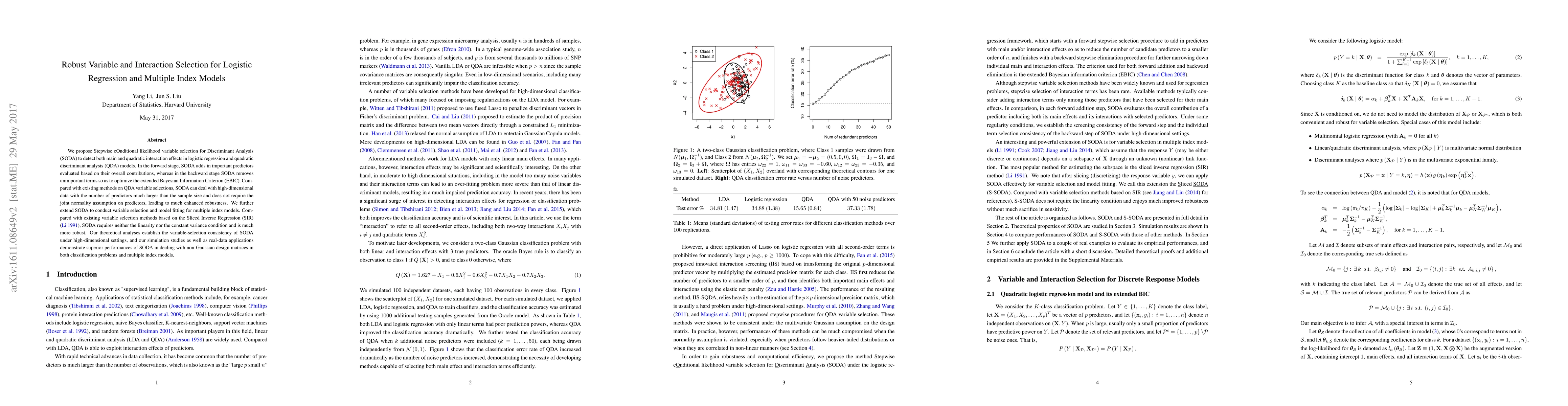 We propose Stepwise cOnditional likelihood variable selection for Discriminant Analysis (SODA) to detect both main and quadratic interaction effects in logistic regression and quadratic discriminant analysis (QDA) models. In the forward stage, SODA adds in important predictors evaluated based on their overall contributions, whereas in the backward stage SODA removes unimportant terms so as to optimize the extended Bayesian Information Criterion (EBIC). Compared with existing methods on QDA variable selections, SODA can deal with high-dimensional data with the number of predictors much larger than the sample size and does not require the joint normality assumption on predictors, leading to much enhanced robustness. We further extend SODA to conduct variable selection and model fitting for multiple index models. Compared with existing variable selection methods based on the Sliced Inverse Regression (SIR) (Li 1991), SODA requires neither the linearity nor the constant variance condition and is much more robust. Our theoretical analyses establish the variable-selection consistency of SODA under high-dimensional settings, and our simulation studies as well as real-data applications demonstrate superior performances of SODA in dealing with non-Gaussian design matrices in both classification problems and multiple index models.