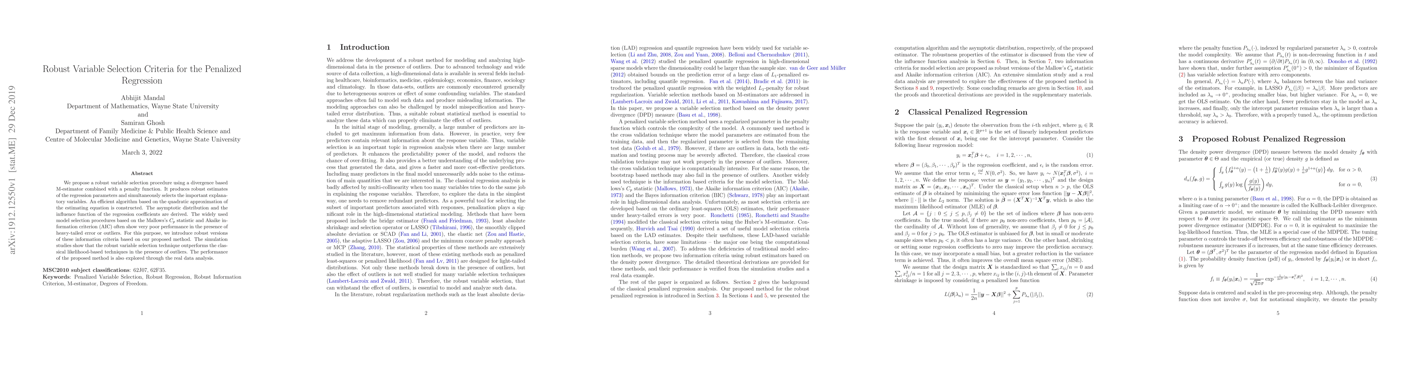 This paper proposes a robust variable selection method using a divergence-based M-estimator with a penalty function, which effectively identifies important explanatory variables and produces robust regression estimates. Simulation studies demonstrate superior performance over traditional methods in the presence of outliers.