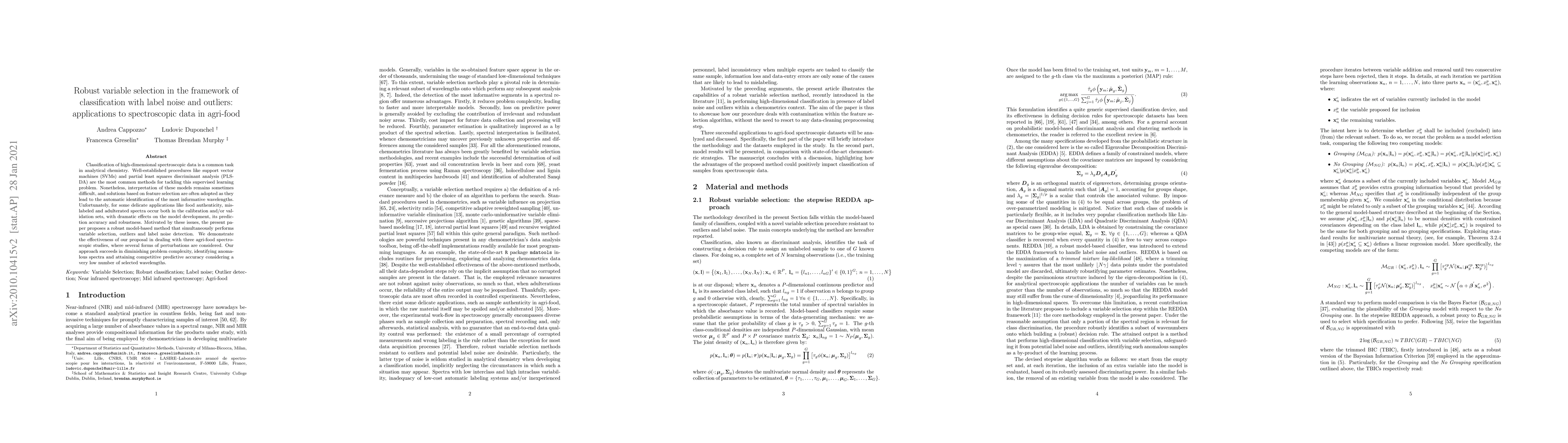 This paper proposes a robust model-based method for variable selection in high-dimensional spectroscopic data classification, addressing label noise and outliers to enhance model accuracy and robustness, demonstrated effectively in agri-food applications. The method identifies informative wavelengths while detecting anomalies, achieving competitive prediction with fewer variables.