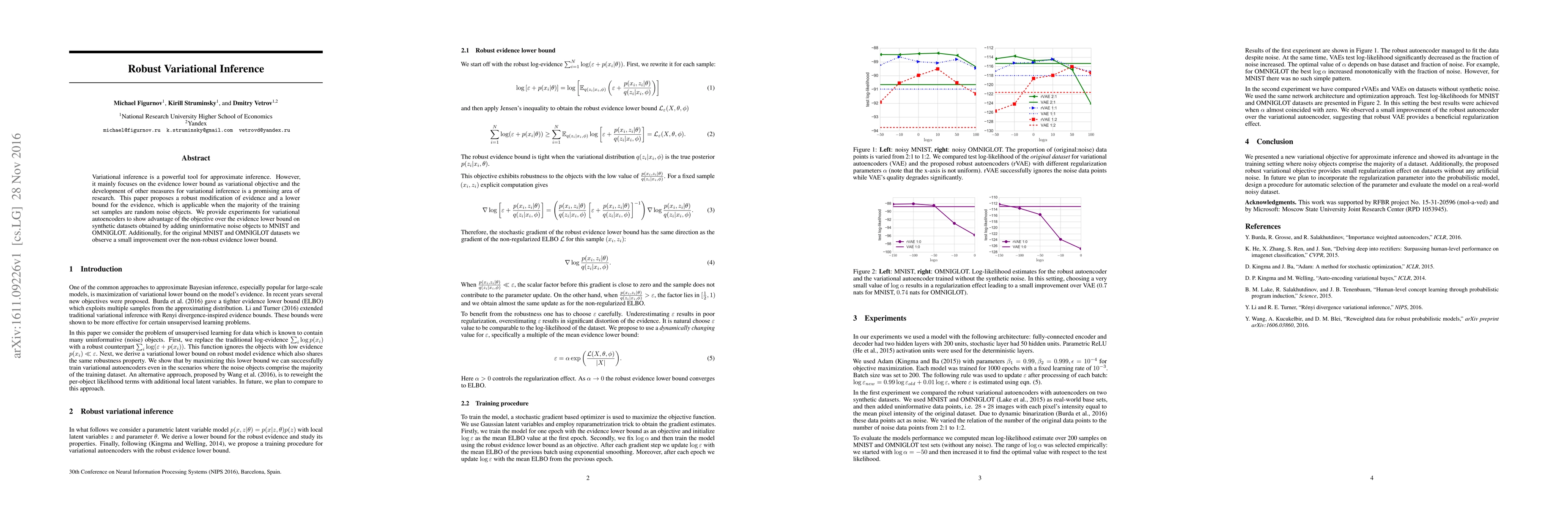 This paper proposes a robust modification of the evidence lower bound for variational inference, particularly useful when training data contains random noise. Experiments on variational autoencoders show its advantage over traditional methods on synthetic datasets with noise, and minor improvements on original datasets.