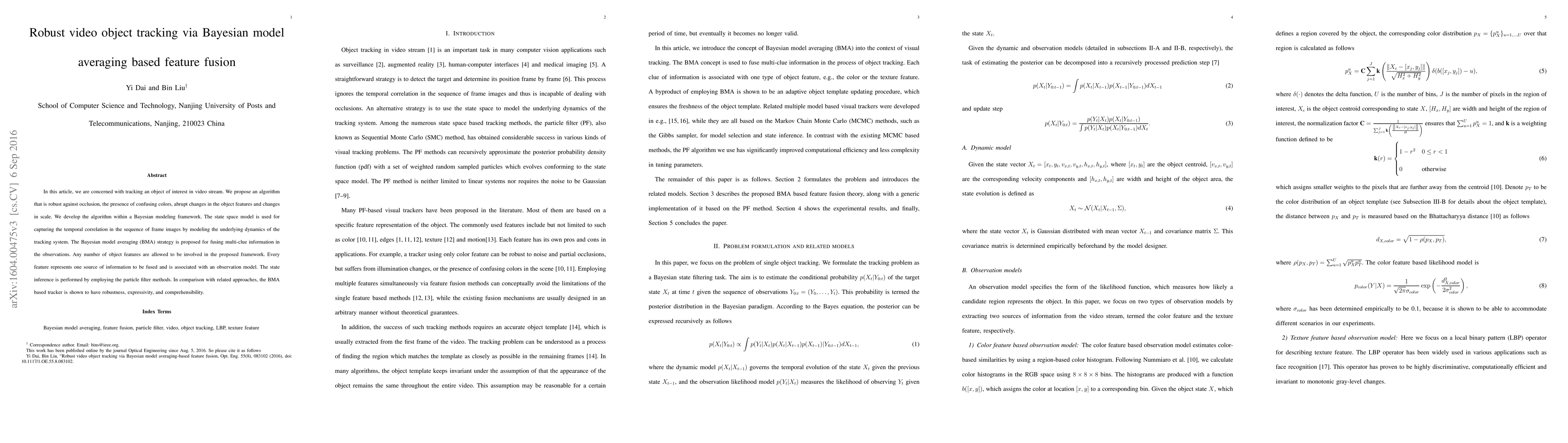 A new algorithm for tracking objects in video using Bayesian model averaging, which combines multiple features to improve robustness against occlusion and changes.