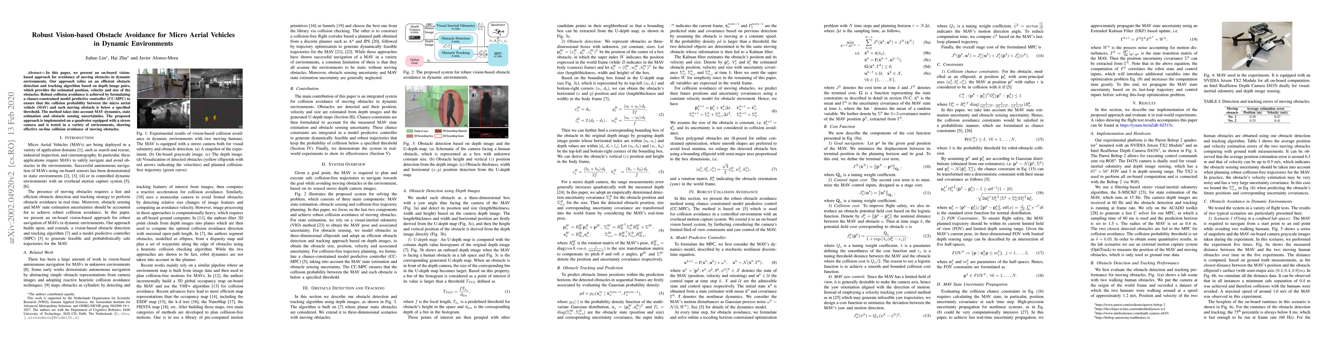 This paper proposes an efficient vision-based method for dynamic obstacle avoidance in micro aerial vehicles using depth image pairs for obstacle detection and tracking. A chance-constrained model predictive controller ensures robust collision avoidance despite uncertainties, validated through quadrotor tests.
