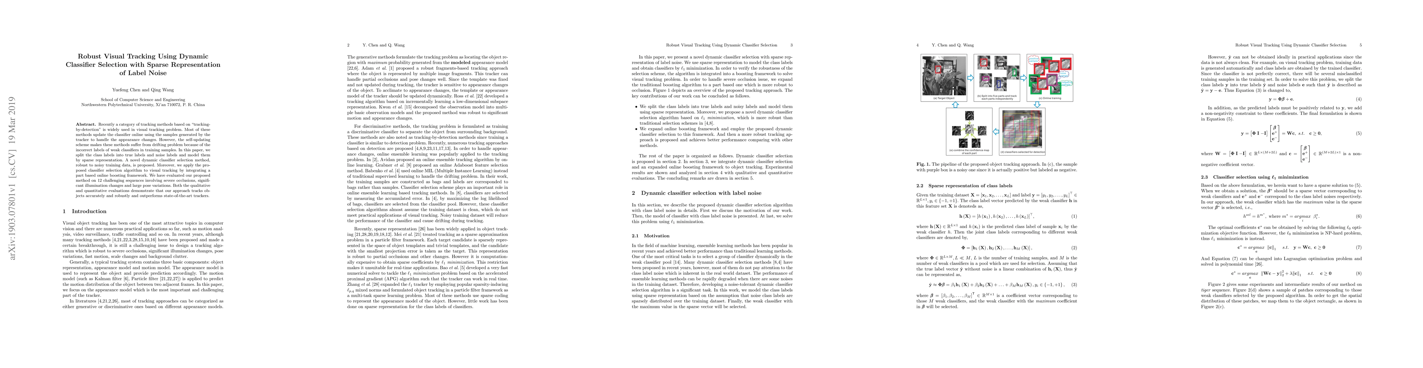This paper proposes a robust visual tracking method using dynamic classifier selection with sparse representation to handle label noise. The method effectively mitigates the drifting problem by distinguishing between true and noisy labels, leading to improved tracking performance on challenging sequences.