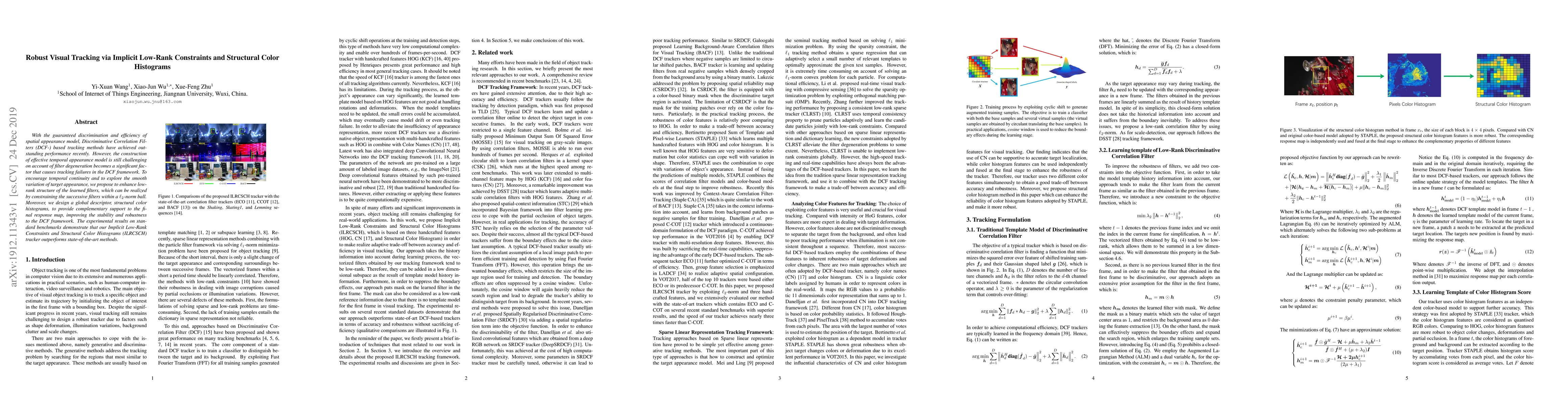 With the guaranteed discrimination and efficiency of spatial appearance model, Discriminative Correlation Filters (DCF-) based tracking methods have achieved outstanding performance recently. However, the construction of effective temporal appearance model is still challenging on account of filter degeneration becomes a significant factor that causes tracking failures in the DCF framework. To encourage temporal continuity and to explore the smooth variation of target appearance, we propose to enhance low-rank structure of the learned filters, which can be realized by constraining the successive filters within a $\ell_2$-norm ball. Moreover, we design a global descriptor, structural color histograms, to provide complementary support to the final response map, improving the stability and robustness to the DCF framework. The experimental results on standard benchmarks demonstrate that our Implicit Low-Rank Constraints and Structural Color Histograms (ILRCSCH) tracker outperforms state-of-the-art methods.