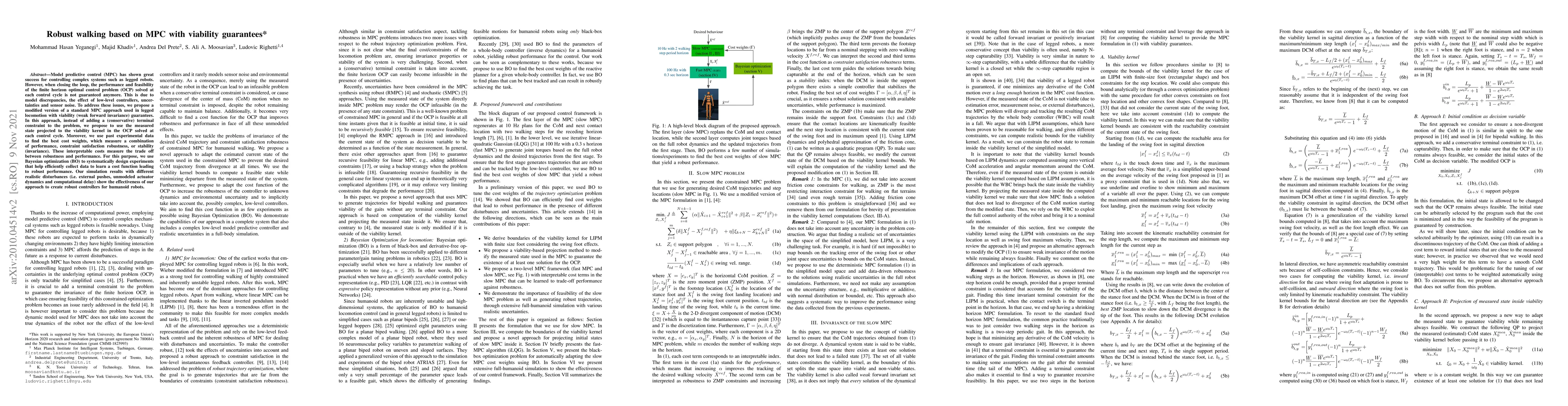 Model predictive control (MPC) has shown great success for controlling complex systems such as legged robots. However, when closing the loop, the performance and feasibility of the finite horizon optimal control problem (OCP) solved at each control cycle is not guaranteed anymore. This is due to model discrepancies, the effect of low-level controllers, uncertainties and sensor noise. To address these issues, we propose a modified version of a standard MPC approach used in legged locomotion with viability (weak forward invariance) guarantees. In this approach, instead of adding a (conservative) terminal constraint to the problem, we propose to use the measured state projected to the viability kernel in the OCP solved at each control cycle. Moreover, we use past experimental data to find the best cost weights, which measure a combination of performance, constraint satisfaction robustness, or stability (invariance). These interpretable costs measure the trade off between robustness and performance. For this purpose, we use Bayesian optimization (BO) to systematically design experiments that help efficiently collect data to learn a cost function leading to robust performance. Our simulation results with different realistic disturbances (i.e. external pushes, unmodeled actuator dynamics and computational delay) show the effectiveness of our approach to create robust controllers for humanoid robots.