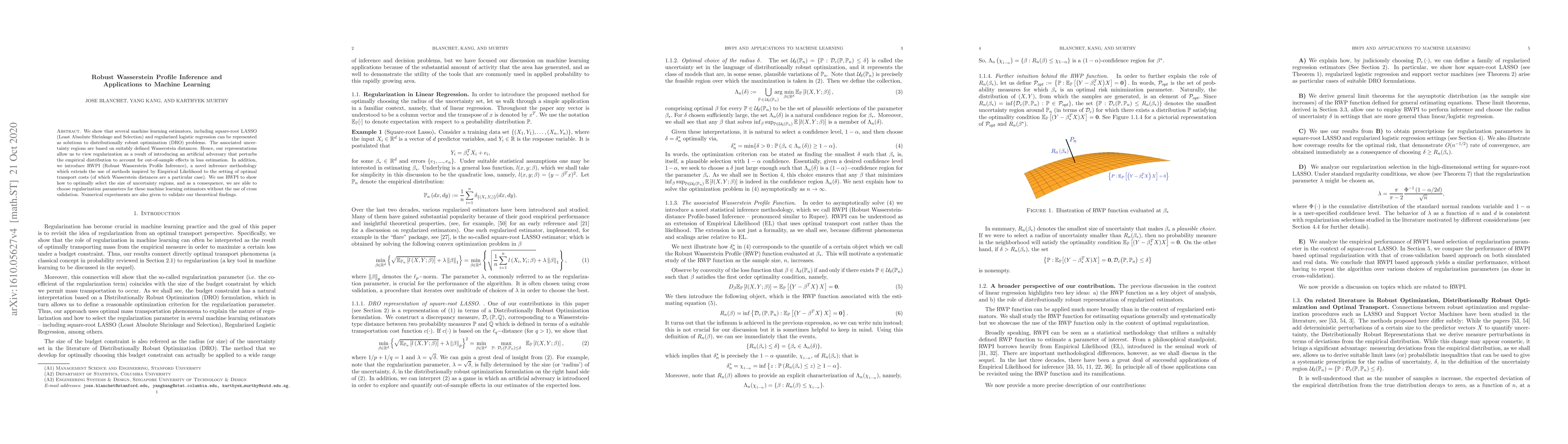 We show that several machine learning estimators, including square-root LASSO (Least Absolute Shrinkage and Selection) and regularized logistic regression can be represented as solutions to distributionally robust optimization (DRO) problems. The associated uncertainty regions are based on suitably defined Wasserstein distances. Hence, our representations allow us to view regularization as a result of introducing an artificial adversary that perturbs the empirical distribution to account for out-of-sample effects in loss estimation. In addition, we introduce RWPI (Robust Wasserstein Profile Inference), a novel inference methodology which extends the use of methods inspired by Empirical Likelihood to the setting of optimal transport costs (of which Wasserstein distances are a particular case). We use RWPI to show how to optimally select the size of uncertainty regions, and as a consequence, we are able to choose regularization parameters for these machine learning estimators without the use of cross validation. Numerical experiments are also given to validate our theoretical findings.