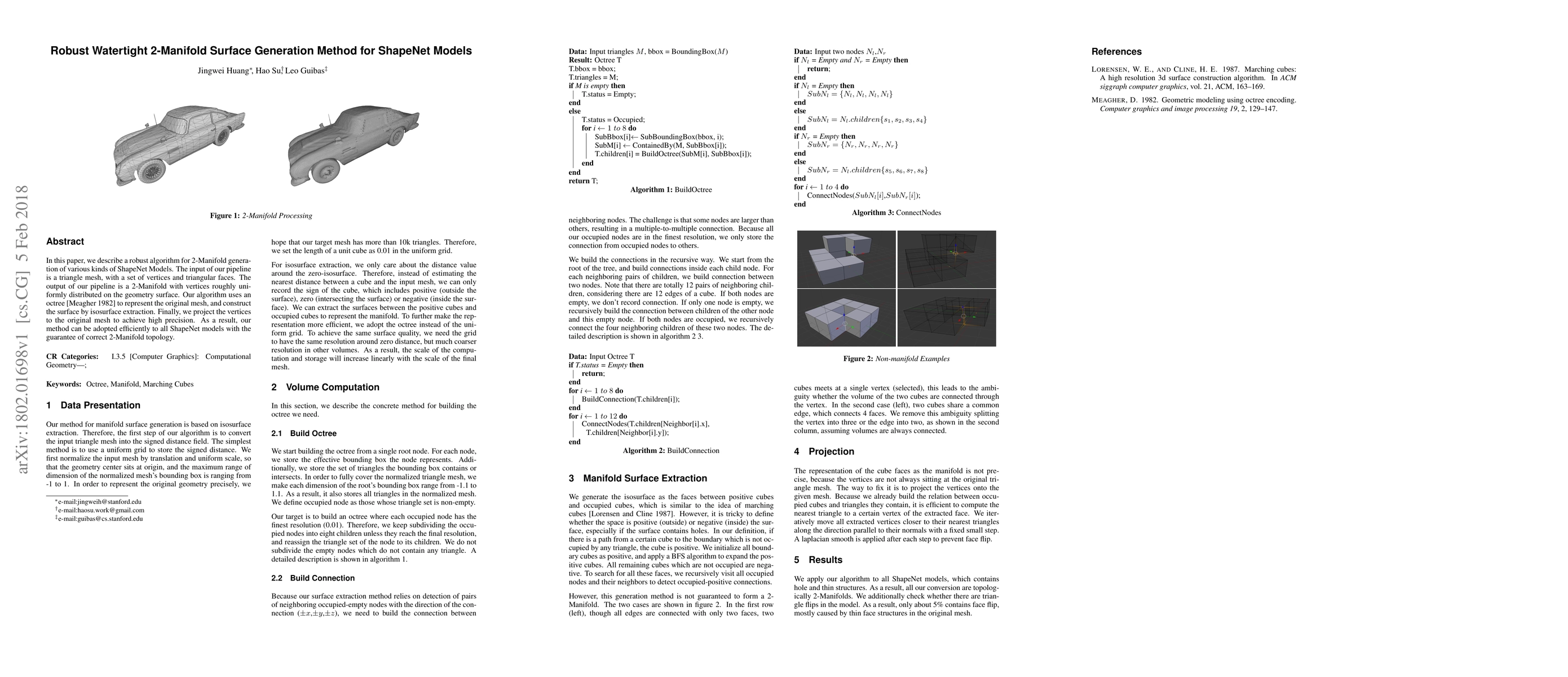 This paper presents a robust algorithm for generating 2-Manifold surfaces from ShapeNet models, utilizing an octree for mesh representation and isosurface extraction to construct the surface, followed by vertex projection for high precision. The method ensures correct 2-Manifold topology for all ShapeNet models.