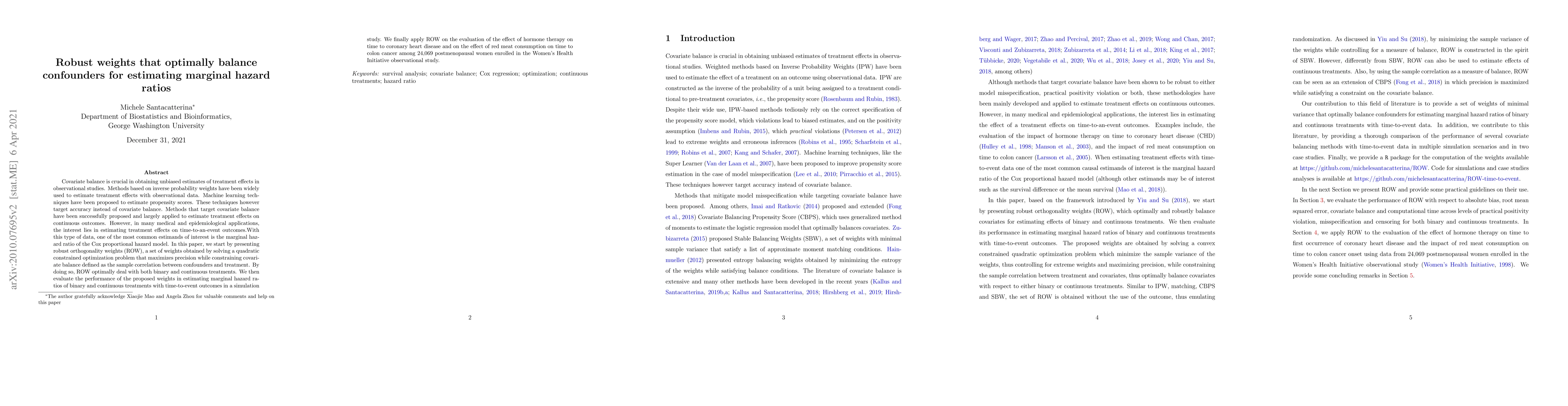A new method called Robust Orthogonality Weights (ROW) is introduced to estimate marginal hazard ratios for time-to-event outcomes, providing optimal balance between confounders and precision in observational studies.