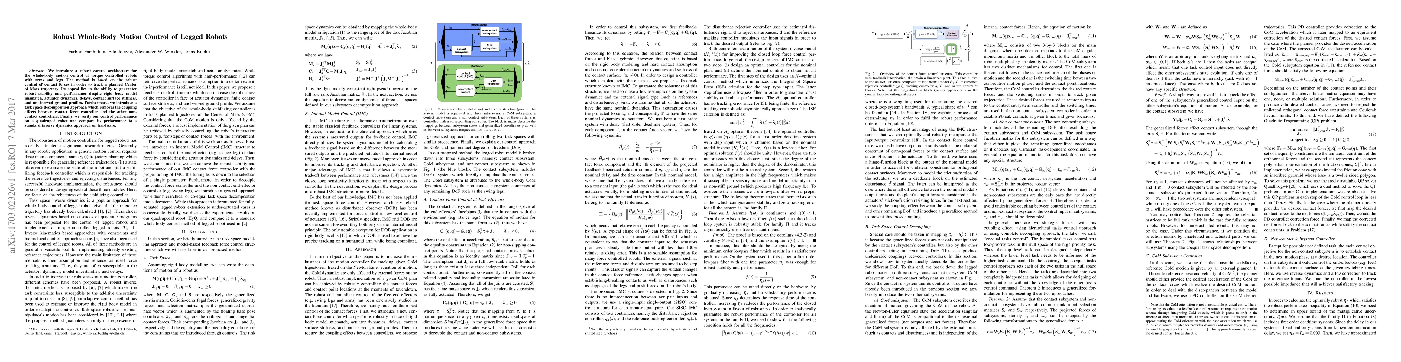 We introduce a robust control architecture for the whole-body motion control of torque controlled robots with arms and legs. The method is based on the robust control of contact forces in order to track a planned Center of Mass trajectory. Its appeal lies in the ability to guarantee robust stability and performance despite rigid body model mismatch, actuator dynamics, delays, contact surface stiffness, and unobserved ground profiles. Furthermore, we introduce a task space decomposition approach which removes the coupling effects between contact force controller and the other non-contact controllers. Finally, we verify our control performance on a quadruped robot and compare its performance to a standard inverse dynamics approach on hardware.